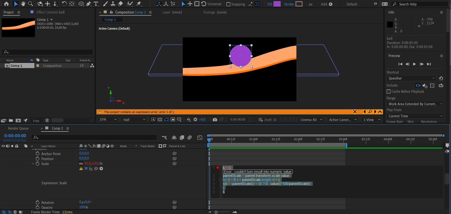 I'm following this tutorial https://www.youtube.com/watch?v=Qupphl-scQY and the first time I got an error message for the first part of the expression. In project settings I switched from JavaScript to Legacy ExtendScript, restarted AE and tried again: the first error solved itself but a new error appeared instead. The orange object is the parent and a 3D object if it matters. Any thoughts on how I could solve this?