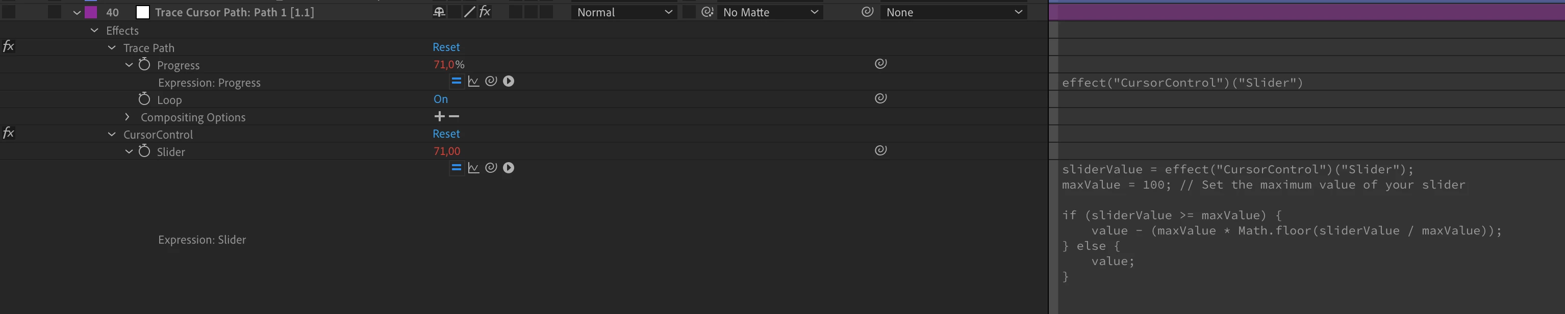 I'm trying to create an expression that makes the property's value jump back to 0 every time it gets to 100. The final goal is to make the cursor cycle the whole way around it's path without stopping.