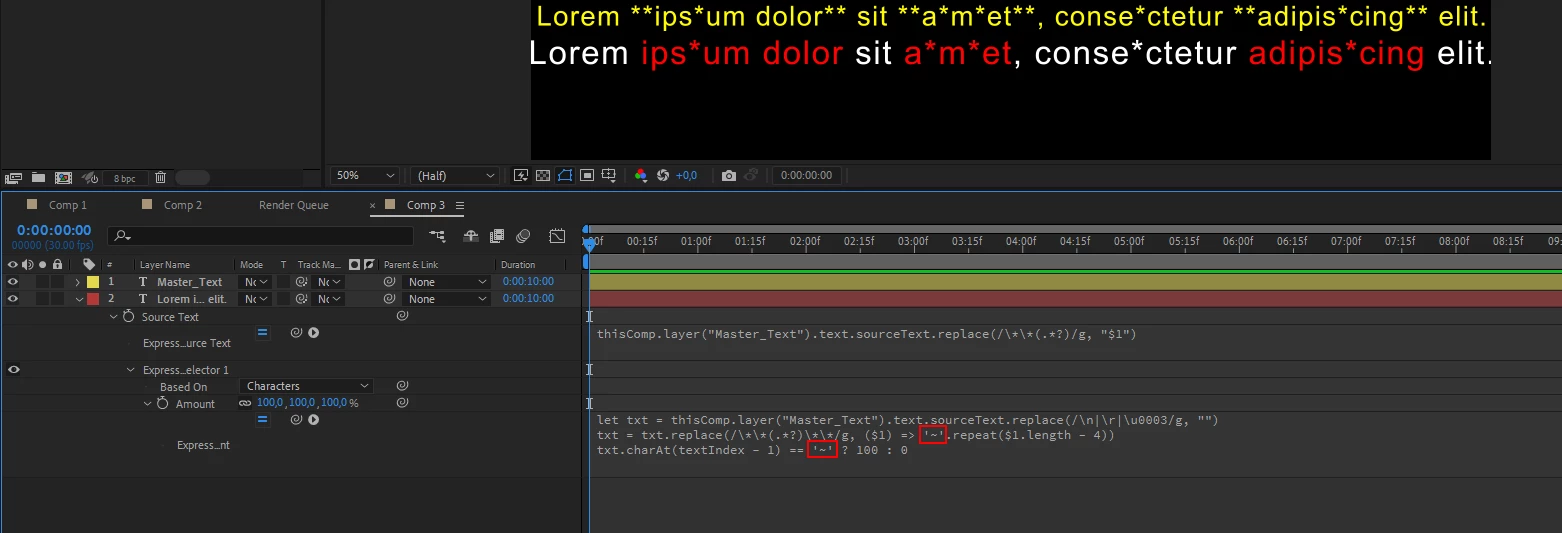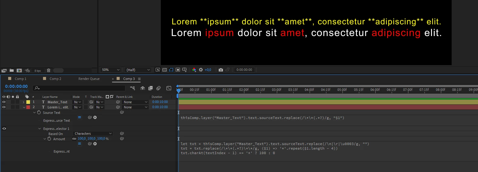 i have to modify a setup, which allows the user to highlight one or multiple words by adding “**” before and after. The original setup works by adding “=” ( For example: This is a =Highlight=). On a separate Text Layer, everything outside those two “=” characters is then faded out by an expression selector and a specific font is chosen to generate a colored box behind the marked text (in this example only behing the word “Highlight”). This setup works pretty good so far, but i can not find a way to mark the words to be highlighted with "**" (two characters) instead of one ("="). Anyone any idea how to modify the following code to make this work? I have already tried to add && txt[i+1] == "*" to the if-statement, but that doesn`t seem to work as expected. It kind worked / find`s the right In-Point / Start of the highlighted word, but messes up the letters / doesn`t find the correct Out-Point of the marked word.