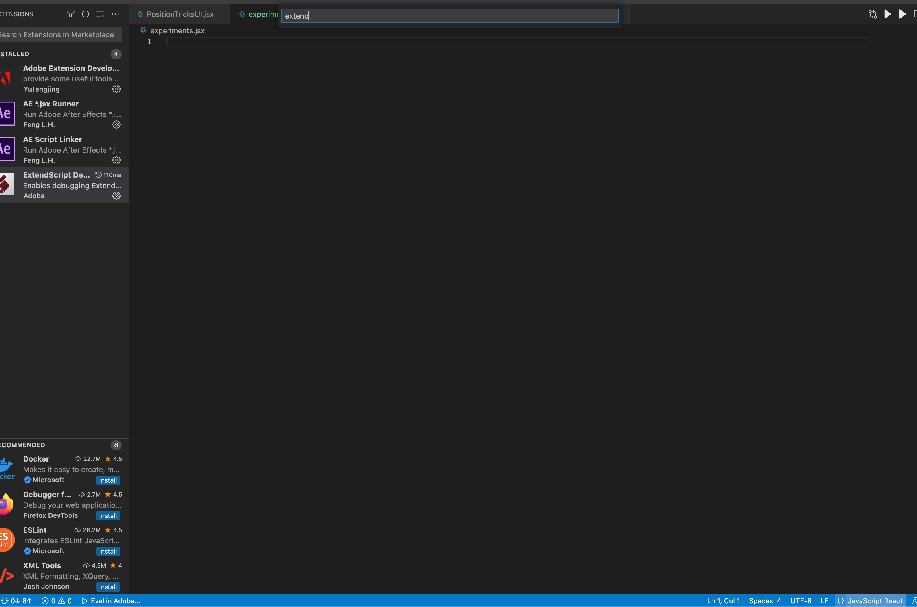Installed extendscript debugger on mac but when opening .jsx file(using rosetta with vs code), it is switched to react mode. And in the options, there is no extendscript.
