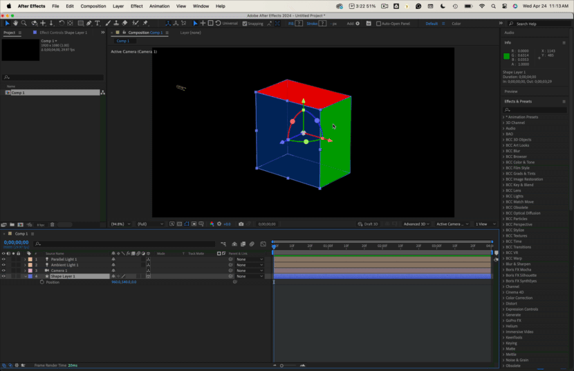You could line up some rectangles on a shape layer. I used four 1-pixel wide, 500 pixels high rectangles with the Transform Rectangle anchor point offset by 250 pixels, each one rotated by 90º to form the outside edge of another 500 X 500 rectangle, then adjusted the colors, added some light and a camera and got this: