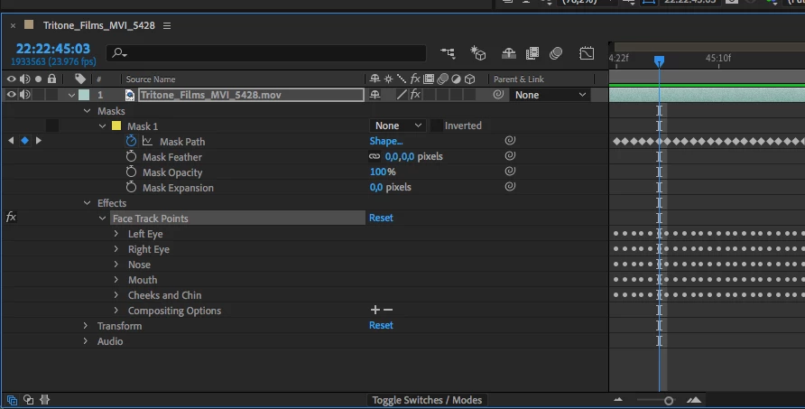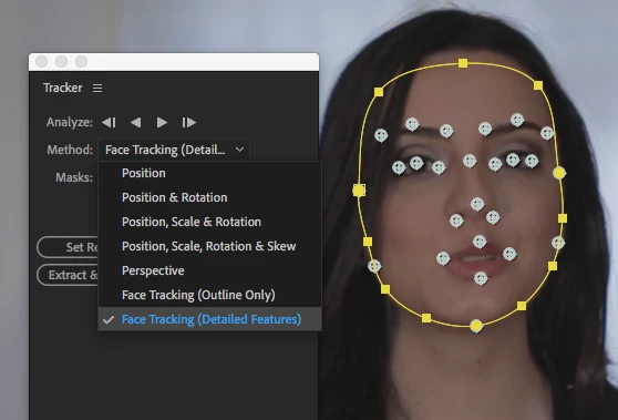 I am attempting to use the mask facial tracker with detailed features (eyes, brows, mouth) to get tracking data for those parts. However, when that option is selected I still do not get the facial tracking points to appear and the main oval mask roughly tracks to the entire face instead. There should be a "Face Track Points" effect on the layer with tracking points on the facial features listed.