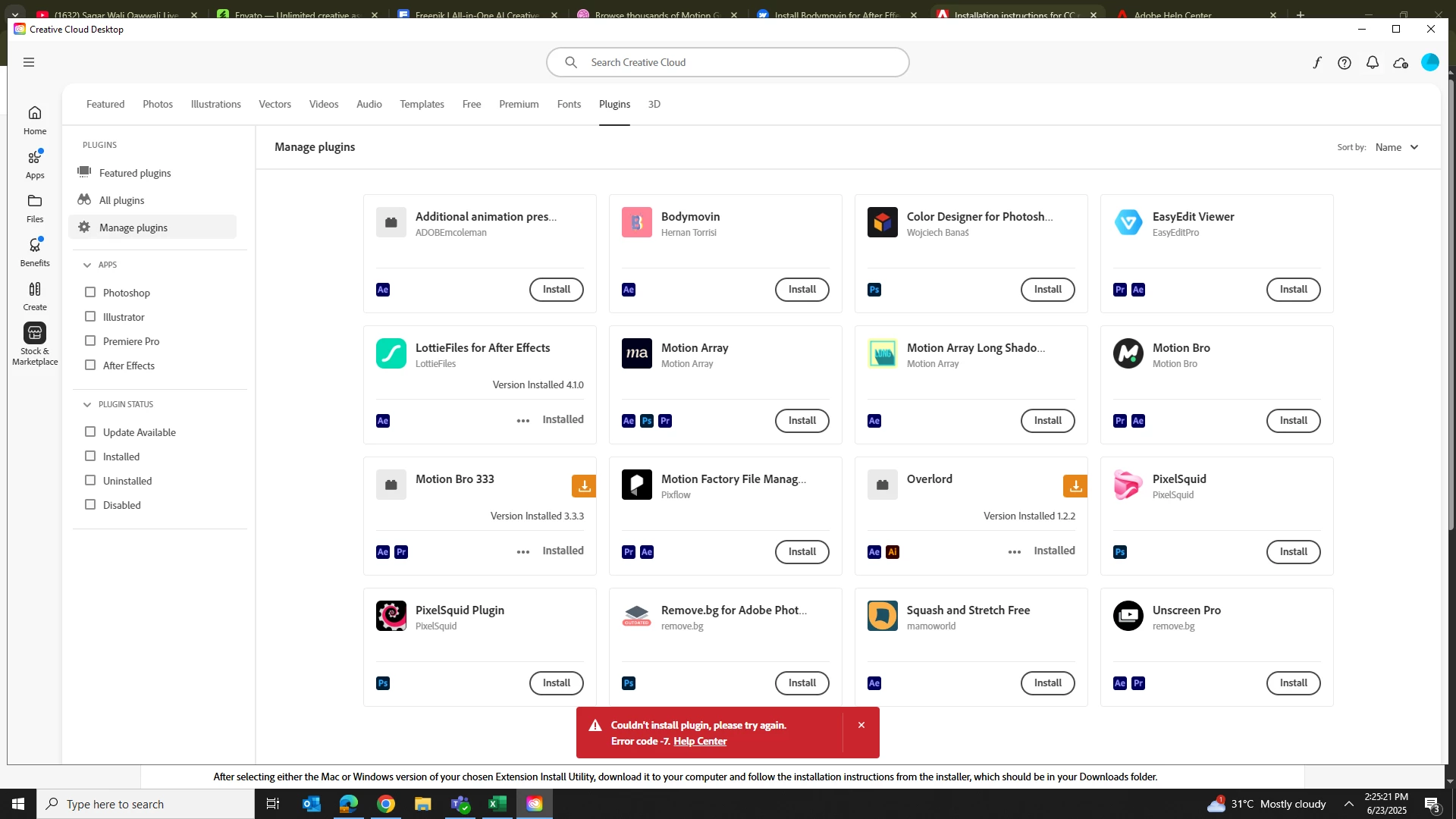 I am facing the below error message while installing Bodymovin Plugin in after effects.