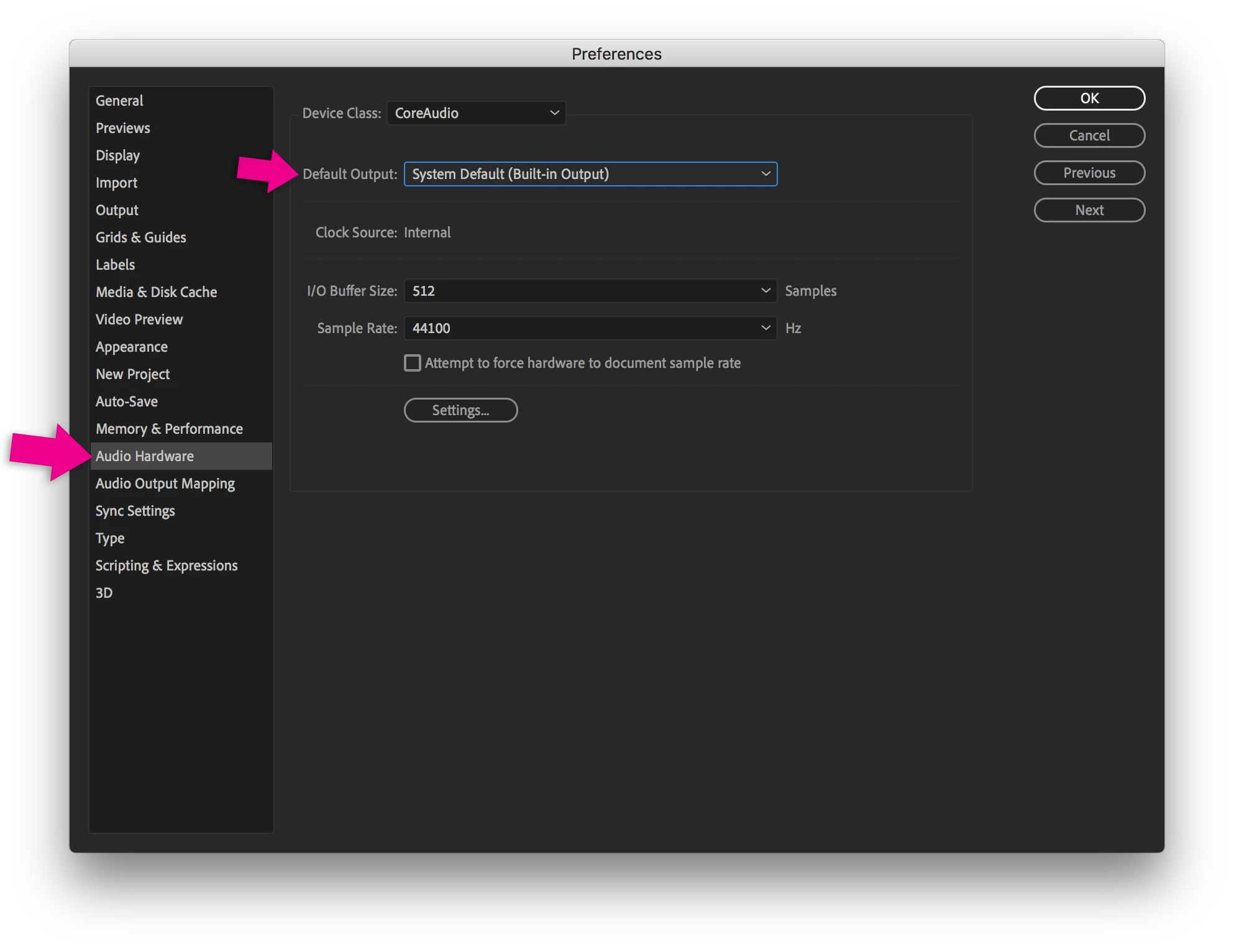 What do you have selected as the Default Output in the Audio Hardware Preferences for After Effects?