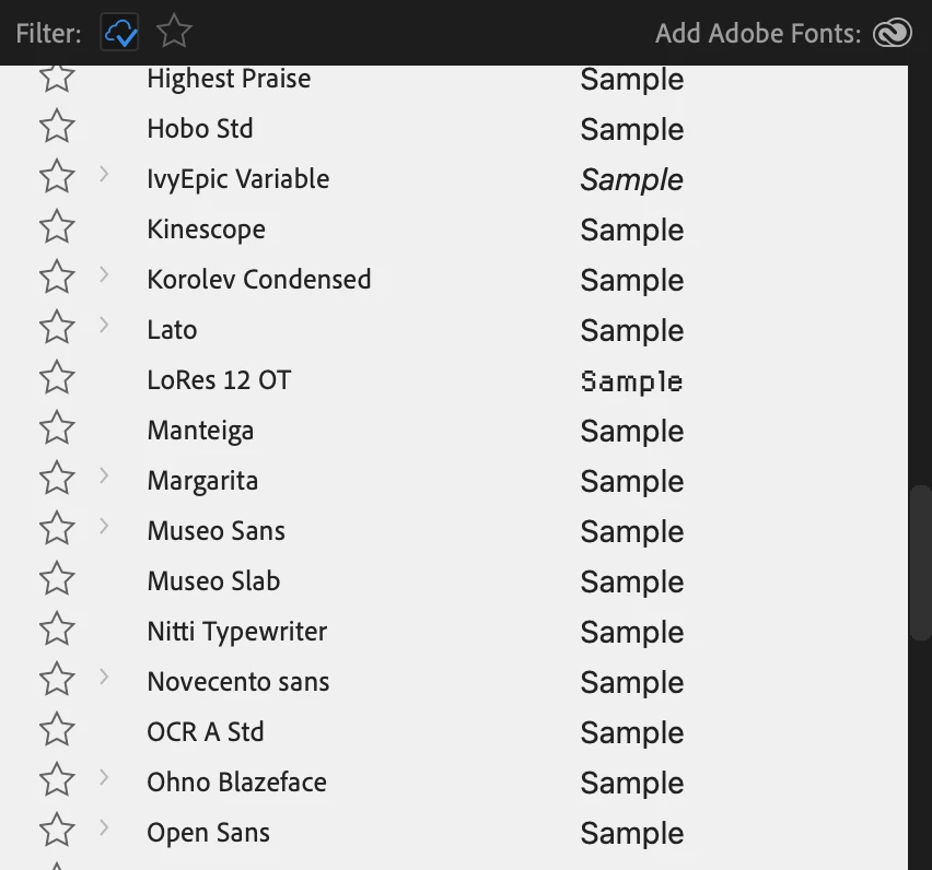 It's also missing some filter options that are available in Illustrator, like weight, serif etc. I can only filter by Adobe fonts.