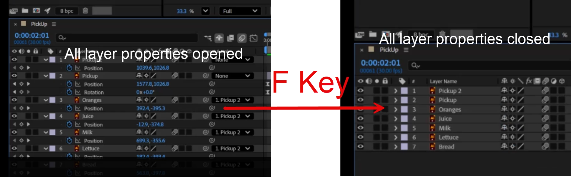 You can see in this screenshot in the LHS all layers properties are opened. Unwittingly I pressed the F key, that closed the all layers properties, you can see it in the RHS. I cannot find out the function of F key in the keyboard shortcut window. How can I find it? Video also attached
