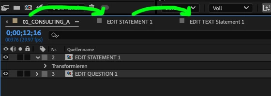 In "EDIT STATEMENT 1" there's another composition called "POSITION Arrow". Here I have to change the position so that it lines up with the end of the new text. Here's the problem: I don't seem to be able to get the correct X and Y coordinates of that text layer inside of the "EDIT STATEMENT 1" composition so that I can use those coordinates to position the arrow. I already found out that I apparently have to get the relative position of the layer in the "outer" composition. But I don't even seem to be able to get the correct coordinates of the text layer itself. So could someone maybe help me to get the coordinates of the upper left corner of the text and the lower right corner so that I can use those to move the "POSITION Arrow" composition accordingly?