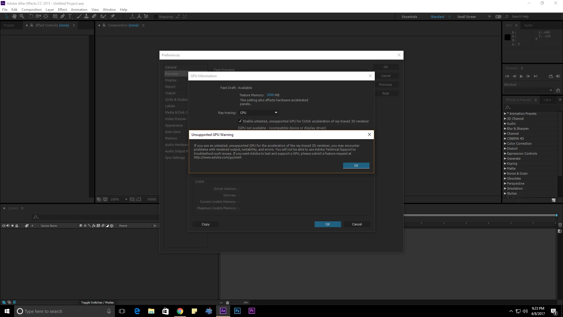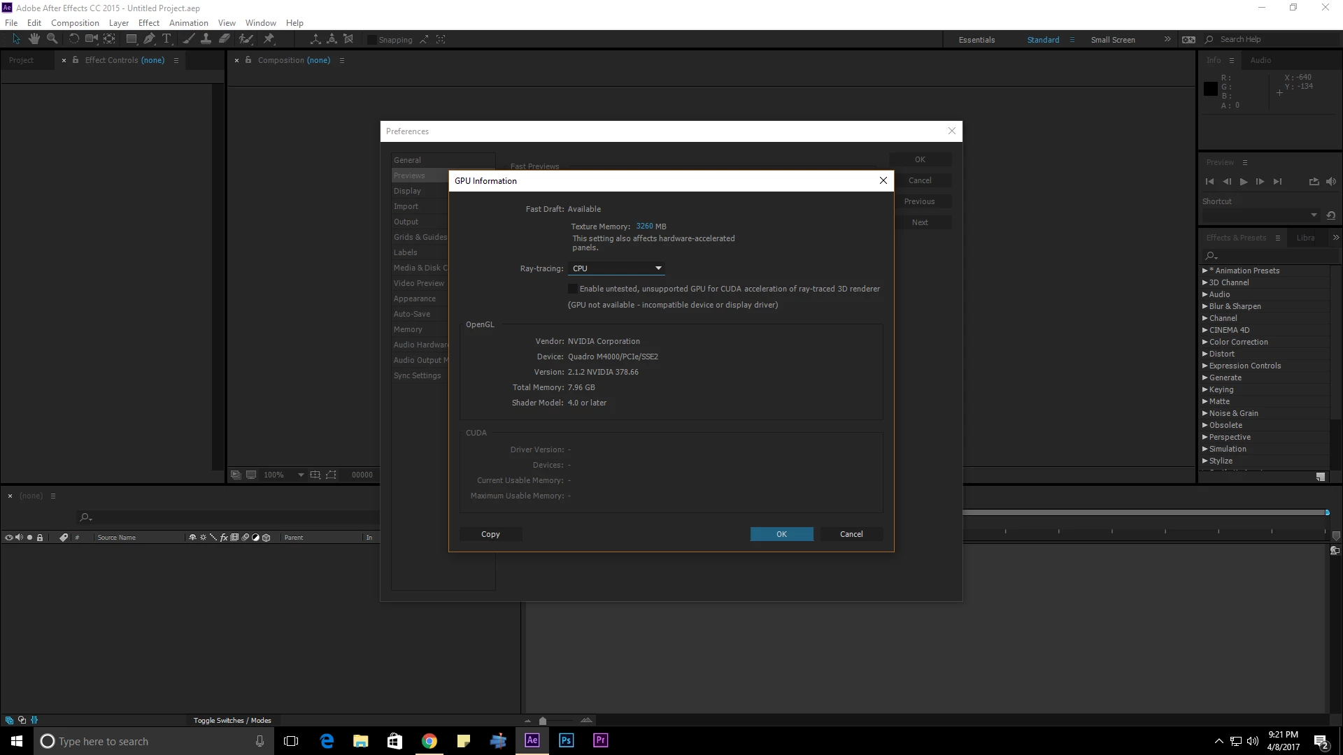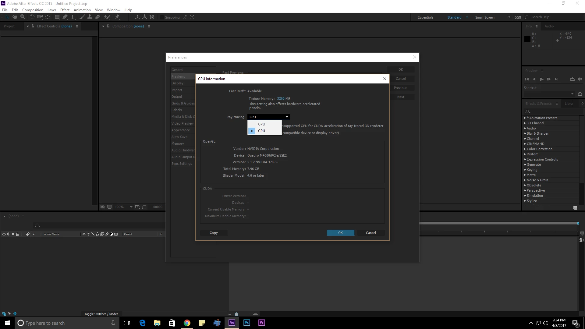 GPU acceleration for ray traced 3D not supported w/ Nvidia Quadro M4000 GPU in After Effect CC 201515