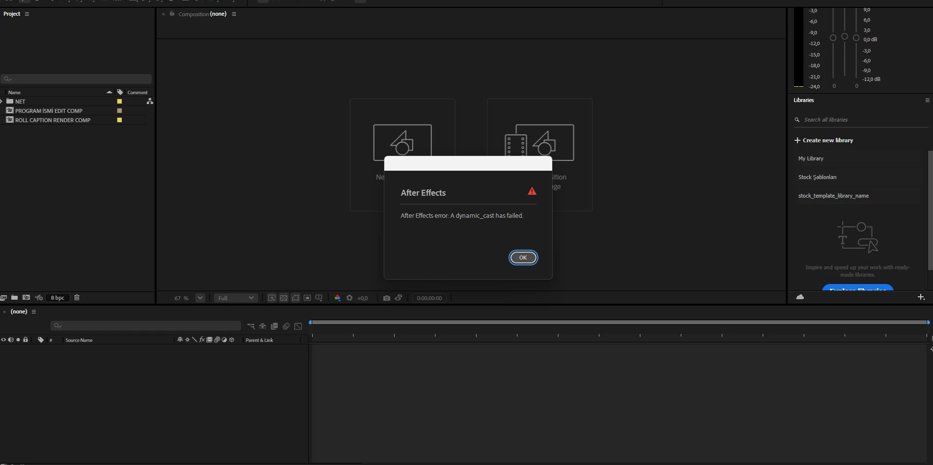 After effects'i normal başlatıyorum ve bu açılışta hata veren Projeyi onun içine atıp çalıştıyorum.. Böyle de tuhaf şeyler yaşatabiliyor after effects ve Premier 😄 😄 😄 😄 ya bir bilsen daha ne tuhaflıklar oluyor gülmekten ölürsün