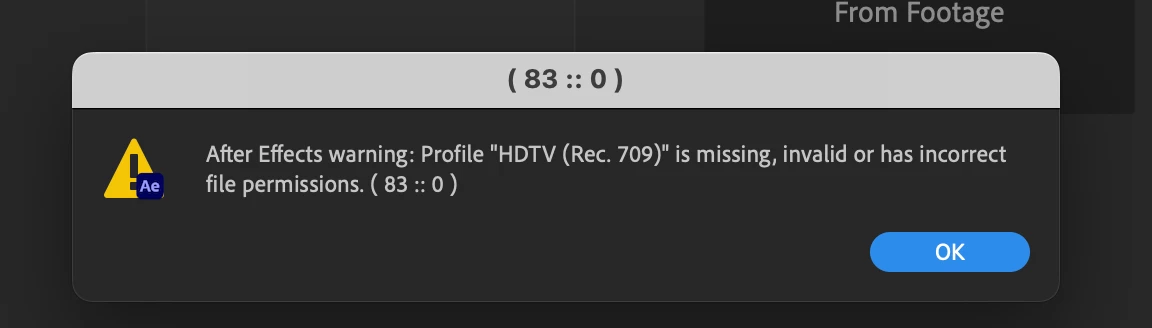 "After Effects warning: Profile "HDTV (Rec. 709)" is missing, invalid or has incorrect file permissions. ( 83 :: 0 )" (see screenshot)