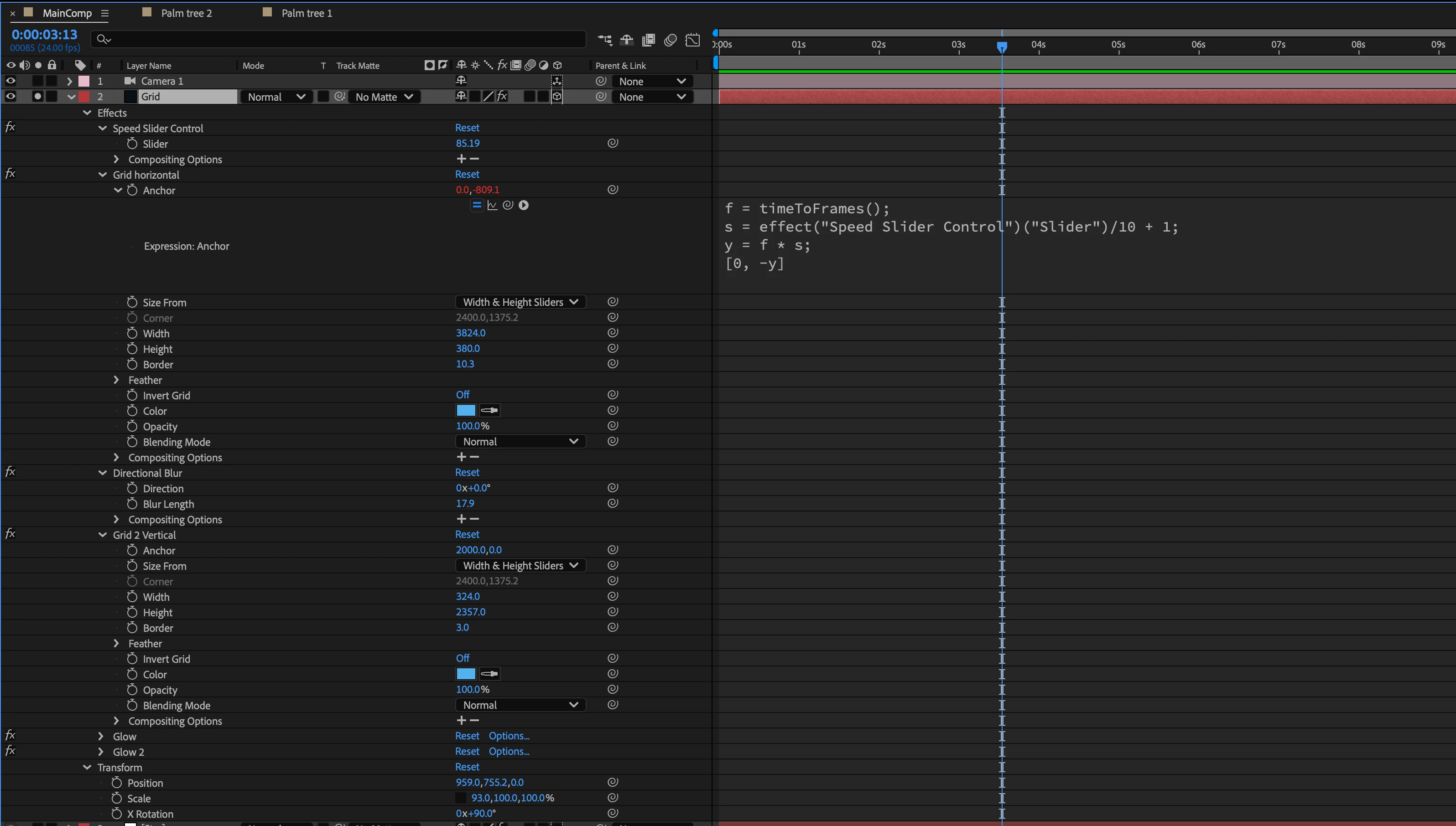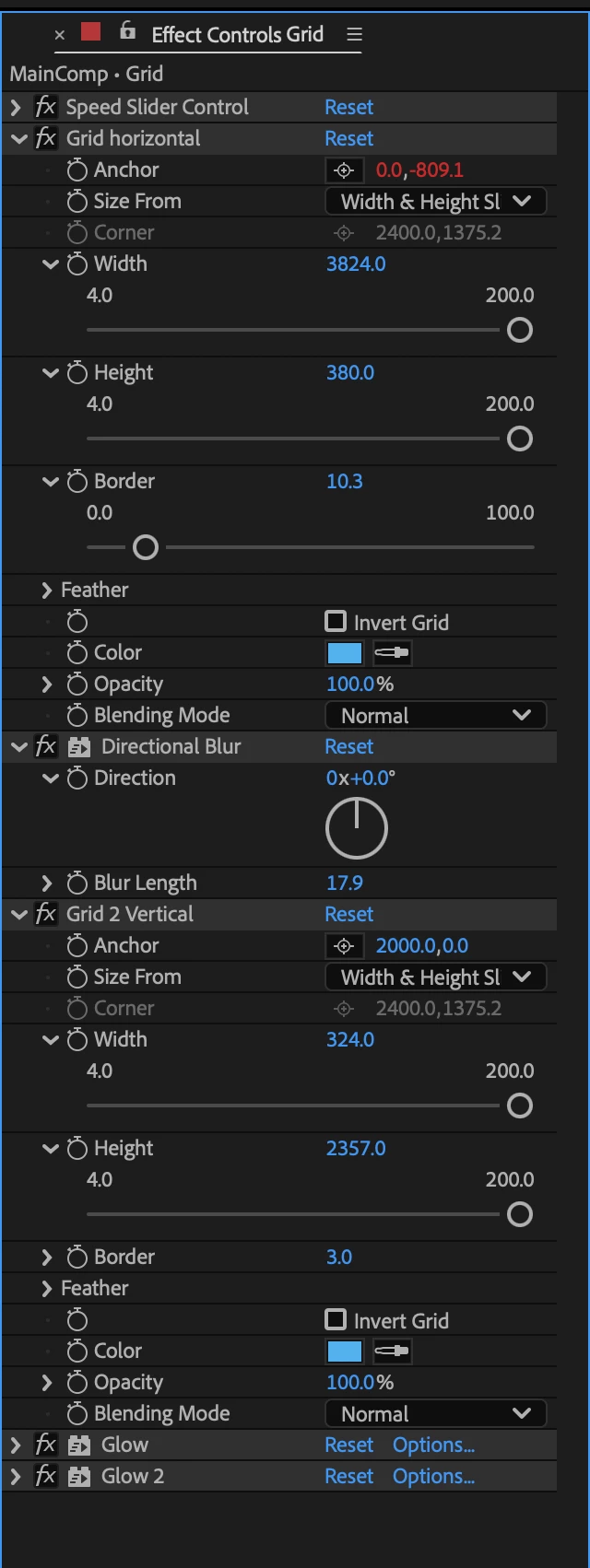 You zoom into the composition panel to about 400% and adjust the Boarder of the horizontal lines, the speed slider, and the Directional Blur settings until you get a uniform looking line at the top of the grid when you step through the timeline one frame at a time using the Ctrl/Cmnd key + the down arrow.