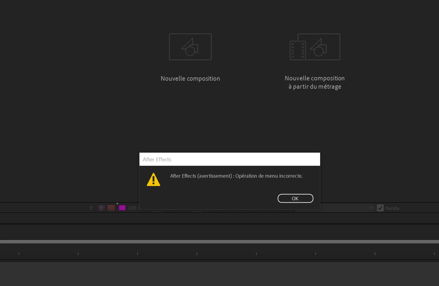 I can't use after effect anymore. I have tried everything, as soon as I want to enter the software menus I get an error message: After effect (warning): Incorrect menu operation.