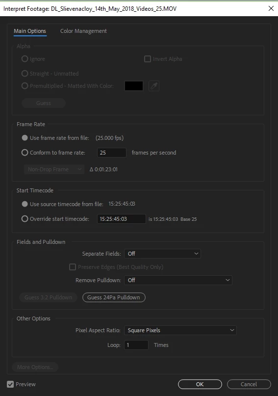 I don't know if it matters to this issue, I read when searching on this white fringing, to check the Alpha channel, on Composite Interperate Footage -> Main but the Aloha settings can't be set/changed: