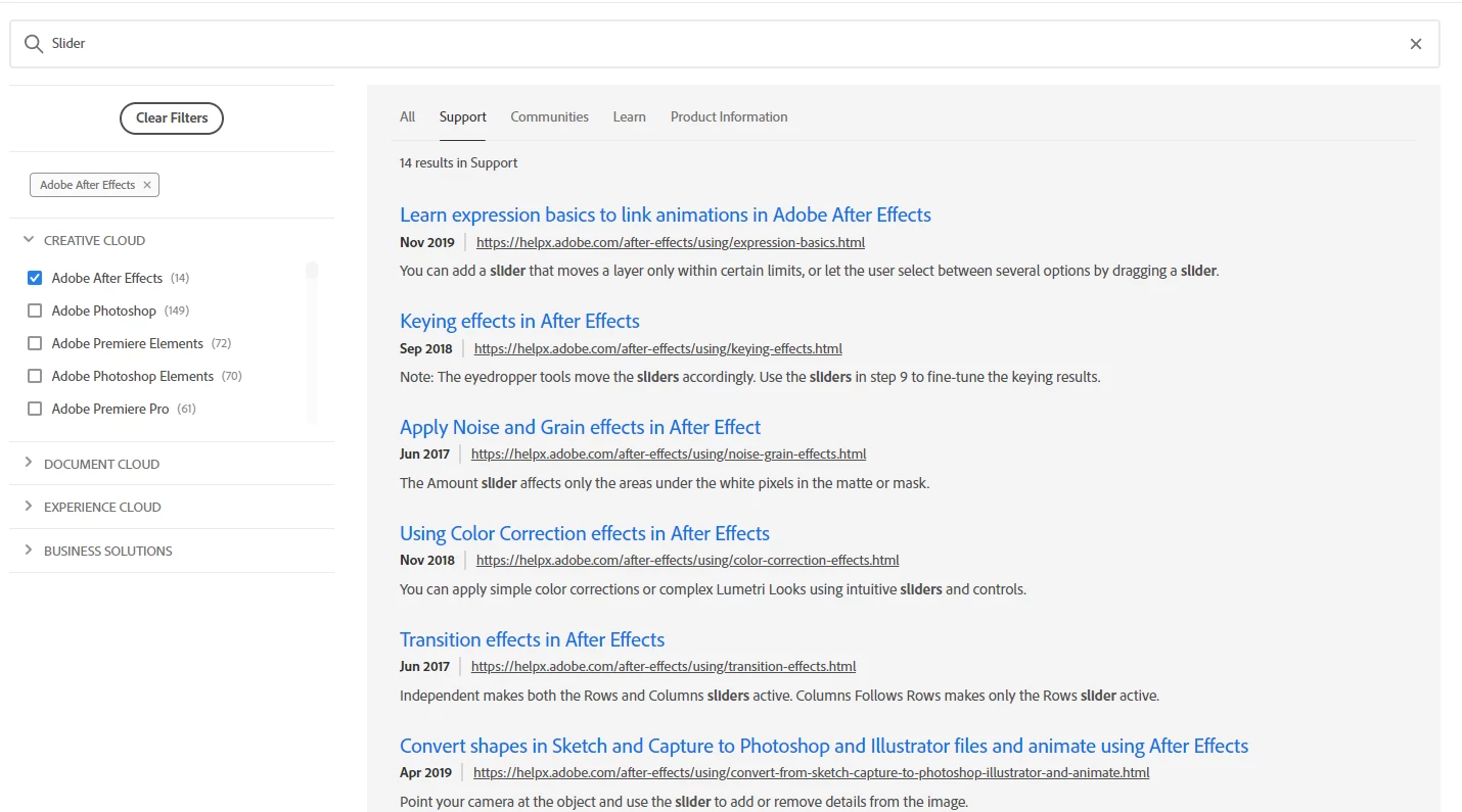 This allows "Adobe helpx After Effects Slider Control" to bring back the following from the After Effects user guide:
