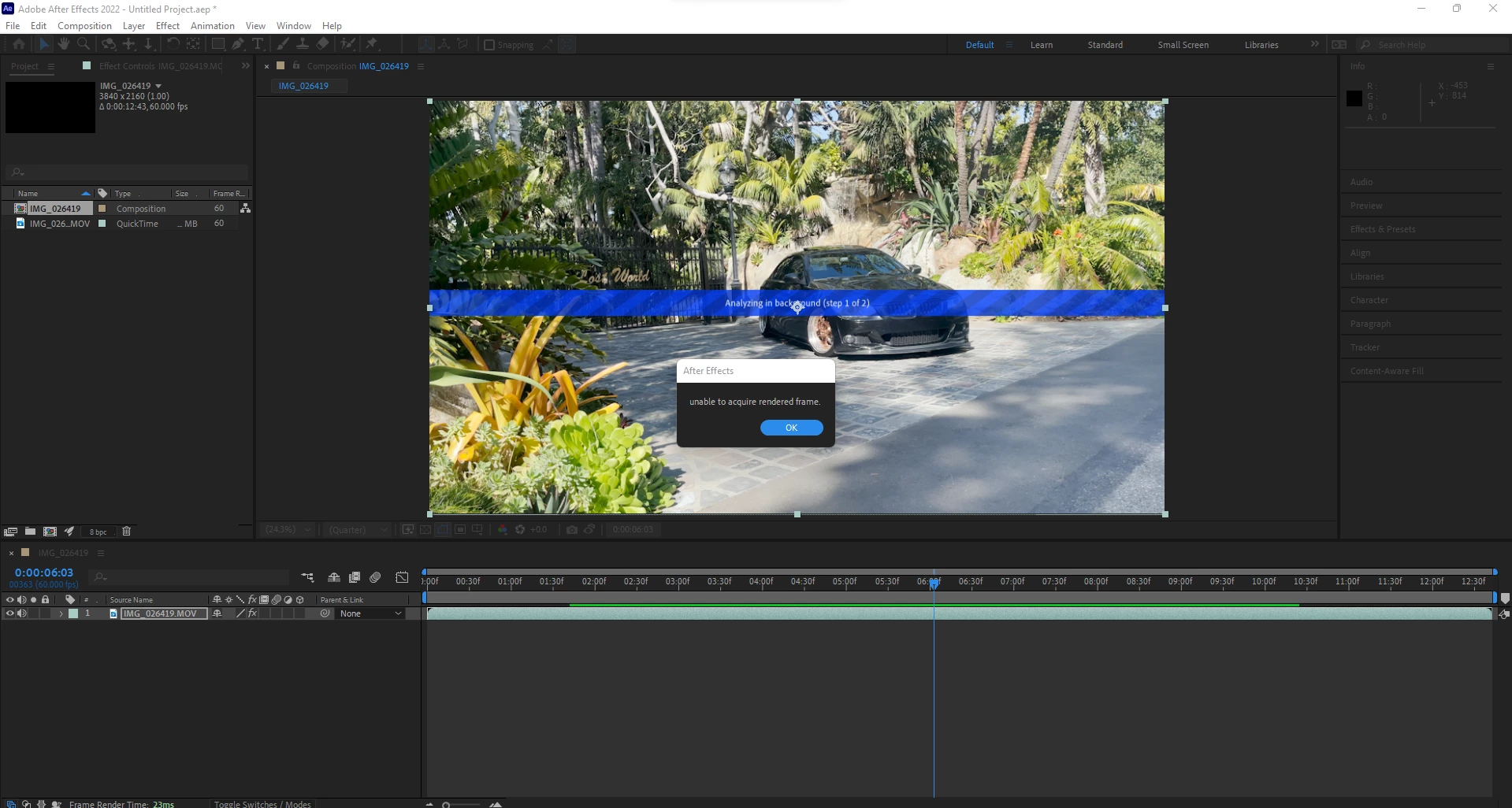 I can't seem to use warp stabalizer or 3D motion track in After Effects. I've tried running it on different versions of After Effects and I still get the same error. I've tried switching the projects settings and used different types of footage and none of that has worked.