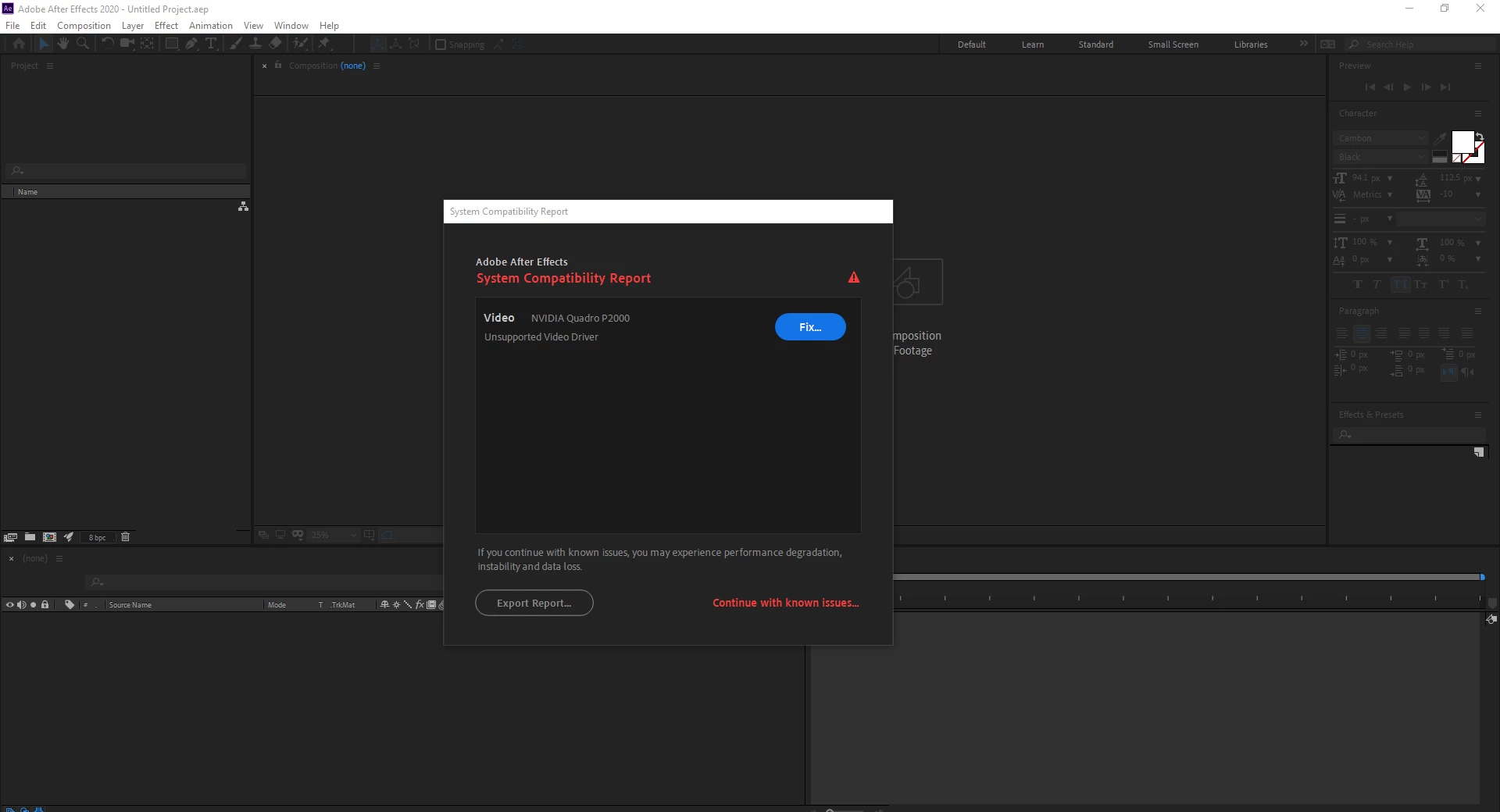 Hi I updated adobe after effect 2020 and received this error message . nvidia quadro p2000 unseport