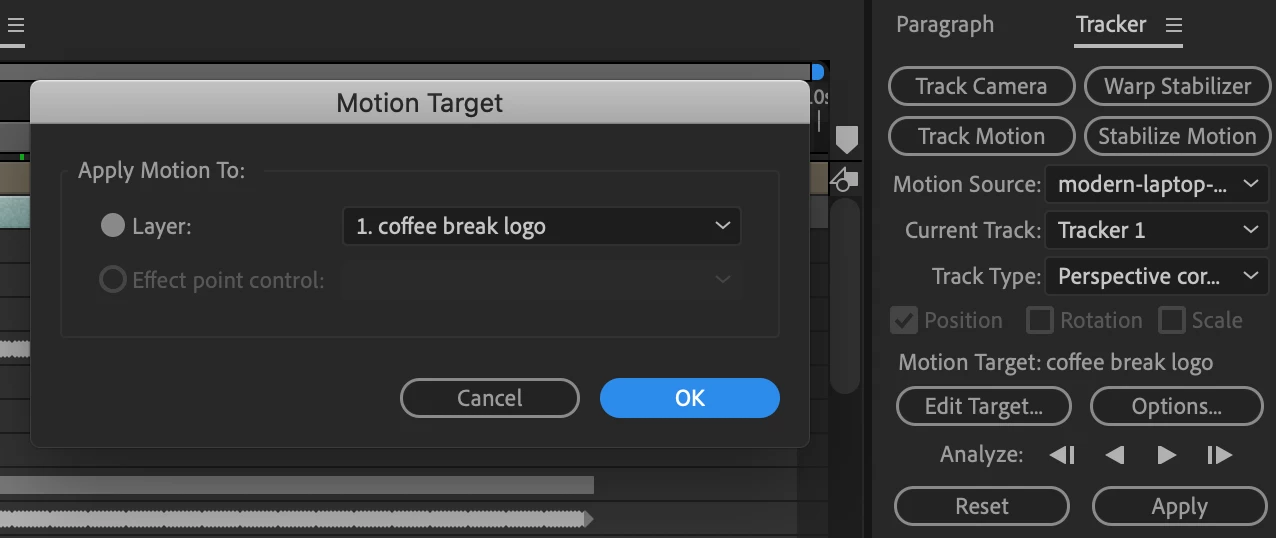 Hey all, I watched a few tutorials about motion tracking and using the perspective corner pin option. i am able to get my tracking points set and i selected my 'Edit Target', which is a pre-comp of an animation. When i hit Apply, my comp screen turns white and i do not get the comp to adhere to the tracking points. from what i have watched this process should be pretty simple. are there settings or nuances that i need to know about and why it isnt working? thanks for any assistance. Lisa