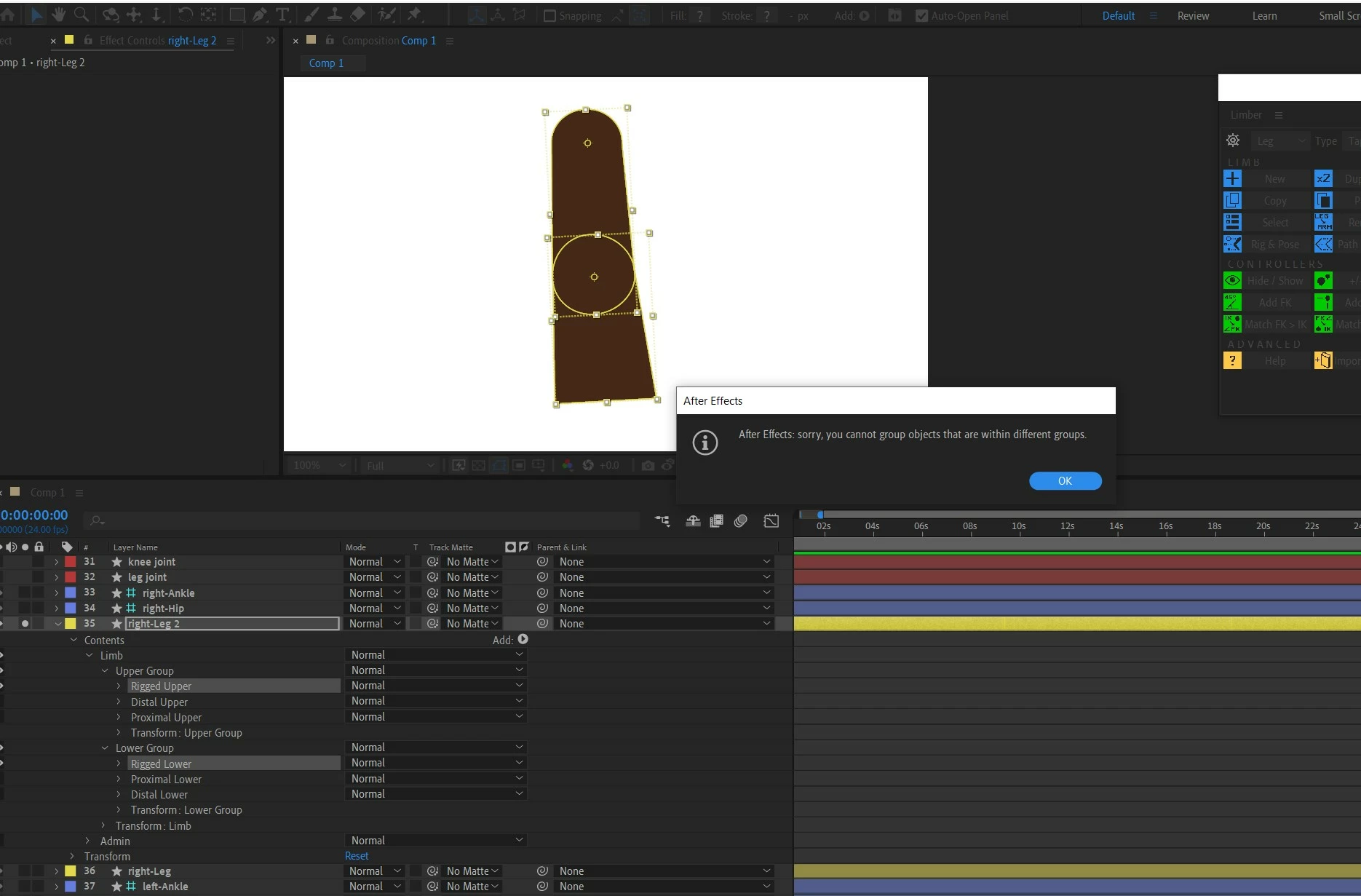 I need to group two diffrenet objects/shapes from different groups. Ae says I cant, But I need to. any guidance how can I do it?