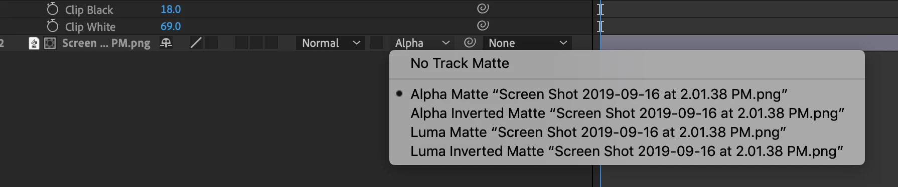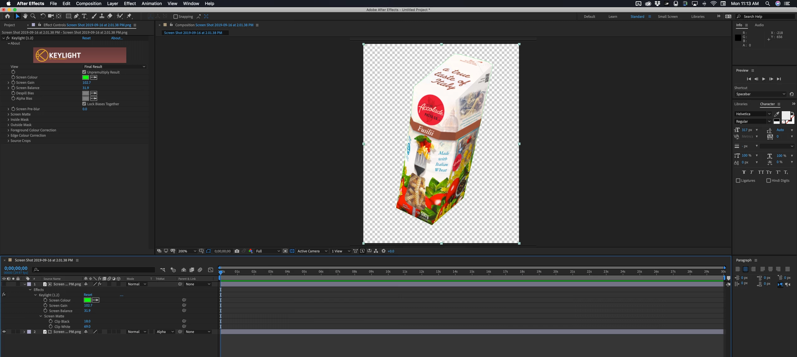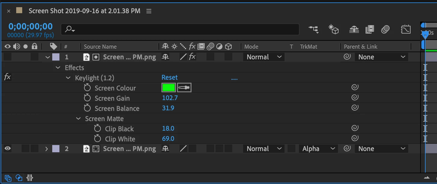 All the options are shown. Keylight creates an alpha channel, Track Matte on the bottom layer uses that alpha channel to create one on the original footage.
