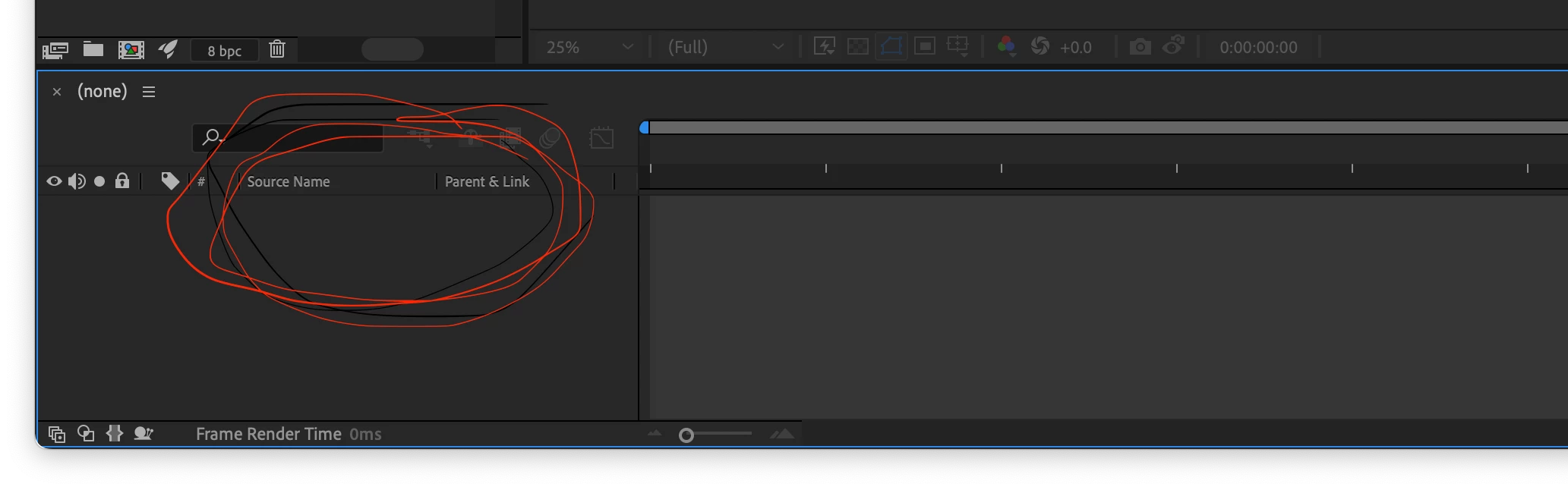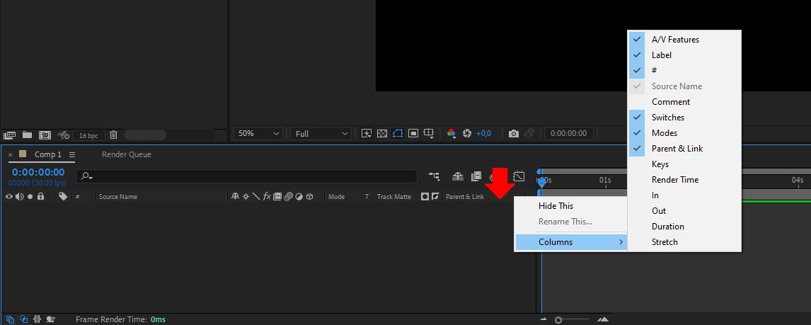 You have to have at least one layer in the composition before anything shows up in any of the columns. Checking the bottom left corner of the Timeline, I also see that you do not have the Switches or the Modes columns turned on. Loading footage in that timeline, you are only going to see the footage name and the Parent/Link options.
