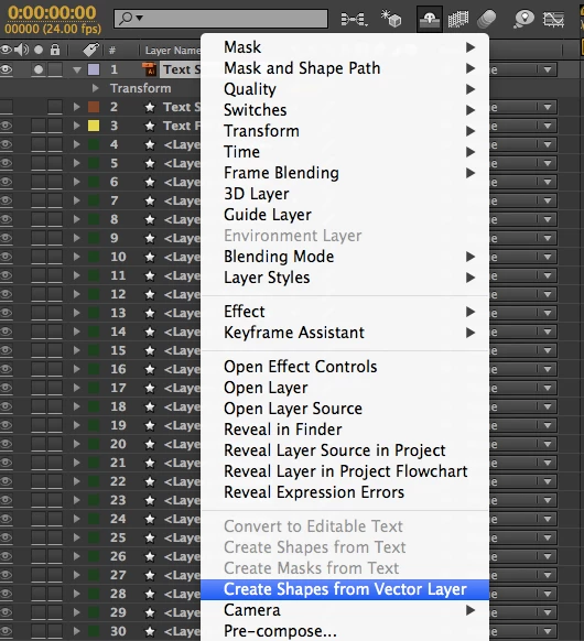 I drag the logo_strokes.ai file onto the composition, right click, and click Create Shapes from Vector Layer.
