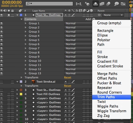 When I select the Contents "drop down" and click Add / Trim Paths, a Trim Paths 1 layer is created.