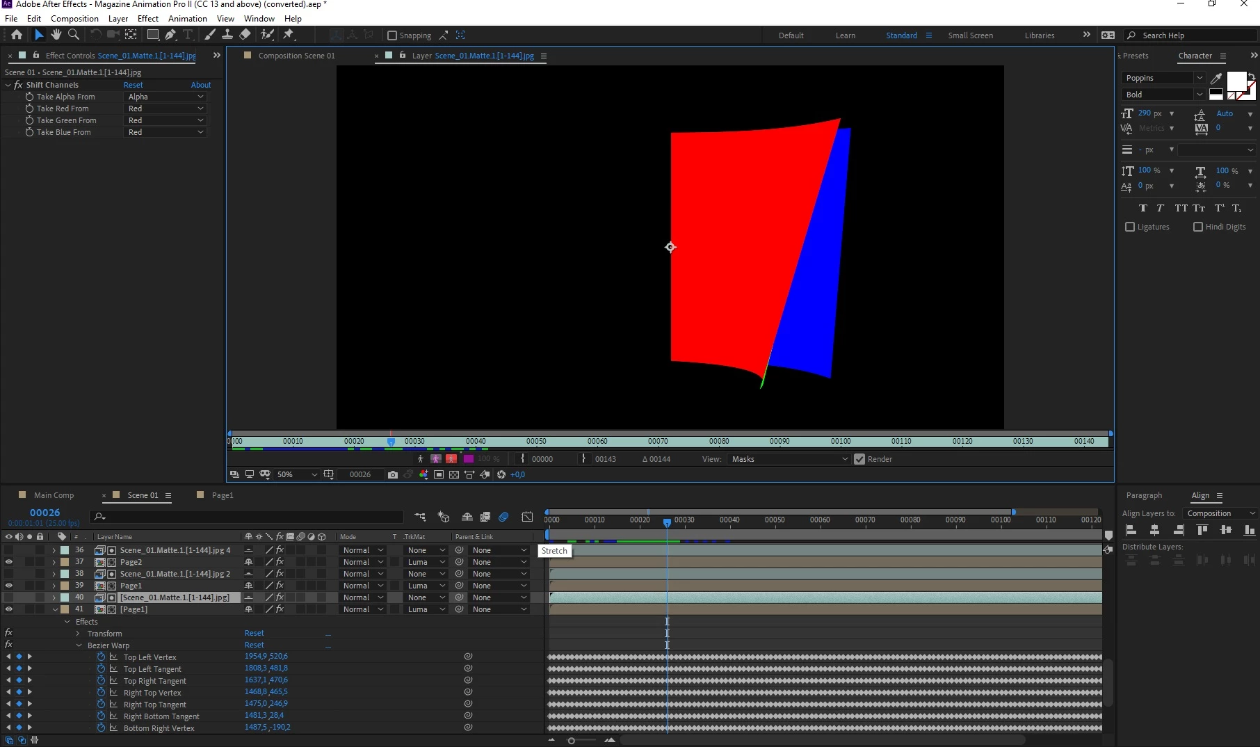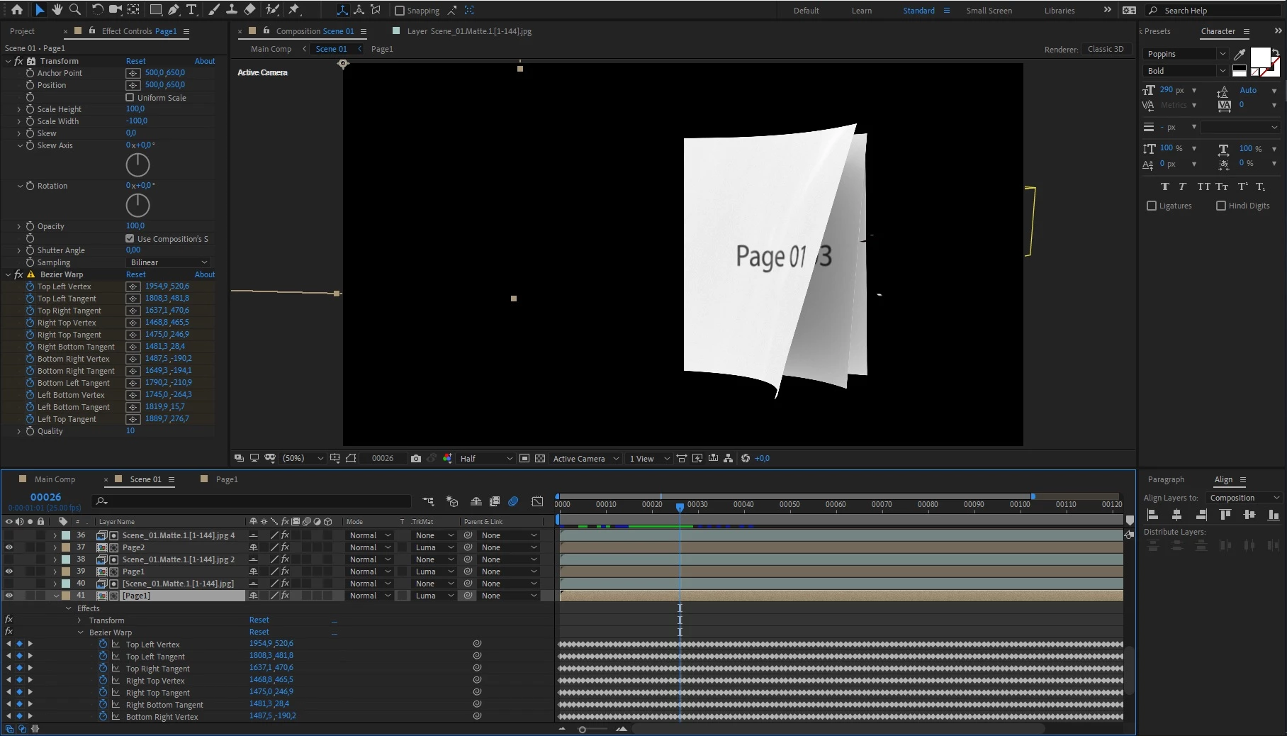 As you see, there are compositions luma matted and animated with Bezier warp. The page animation was created in 3D software probably and linked as sequence files.
