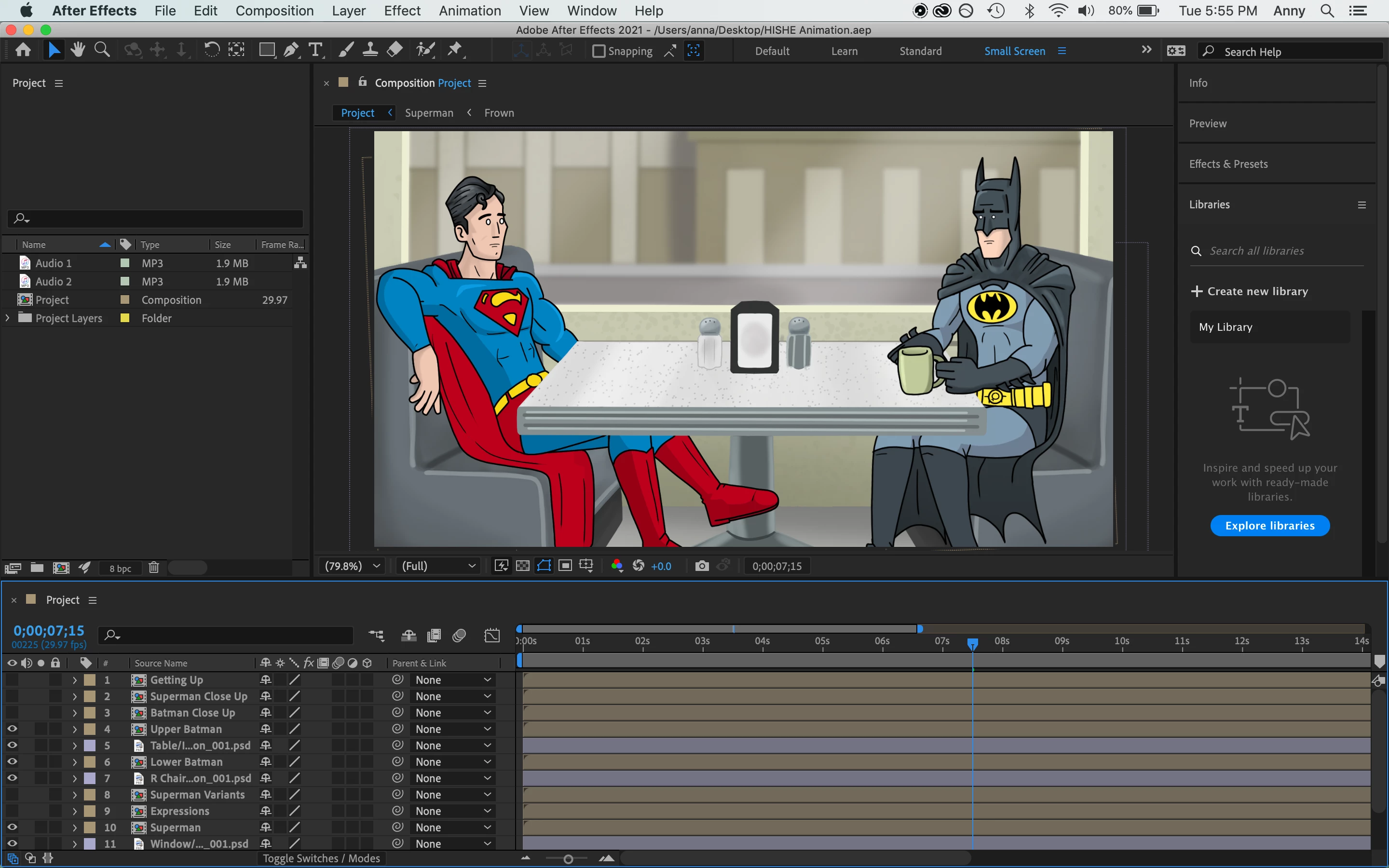 I’m animating a scene with two characters talking to each other. I have everything on its own layer, so if I need to move the eyes or hands, I can. Everything is going well in that respect.