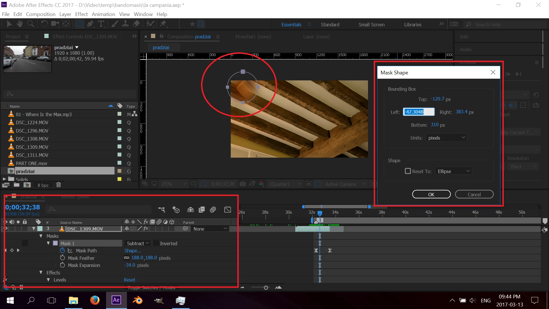 (As I said, I drew the circle mask from the center, holding CTRL and SHIFT, and the circle's boundaries were beyond the comp window. I set the keyframe and went about 1 back in the timeline, clicked on Shape in Mask Path and set all Bounding Box parameters there to 0. Mask mode is Substract. I don't use Track Matte because I don't know how to feather a Shape Layer - I need a feathered mask here)