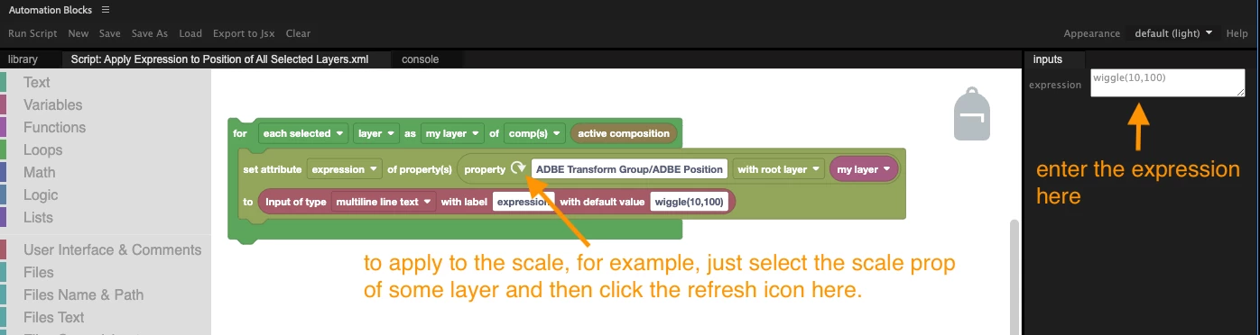 How can I apply an expression to multiple layers at once using Automation Blocks? I don't like manually copying and pasting the expression to each layer. I also don't want to open layers and select all properties manually. Instead, I want to enter the property name in a dropdown menu or input box and apply the expression to the selected layers' properties.