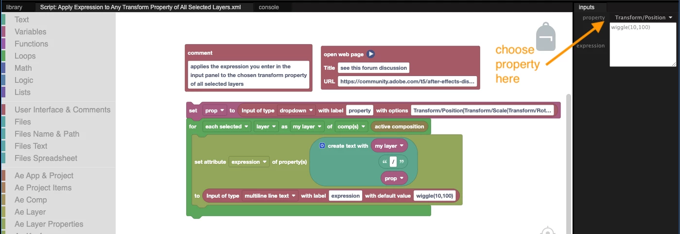 I select multiple layers and run the script. A dialog box opens where I enter the property name, such as "position" and the expression. Then, the script applies the expression to the specified property for all selected layers.