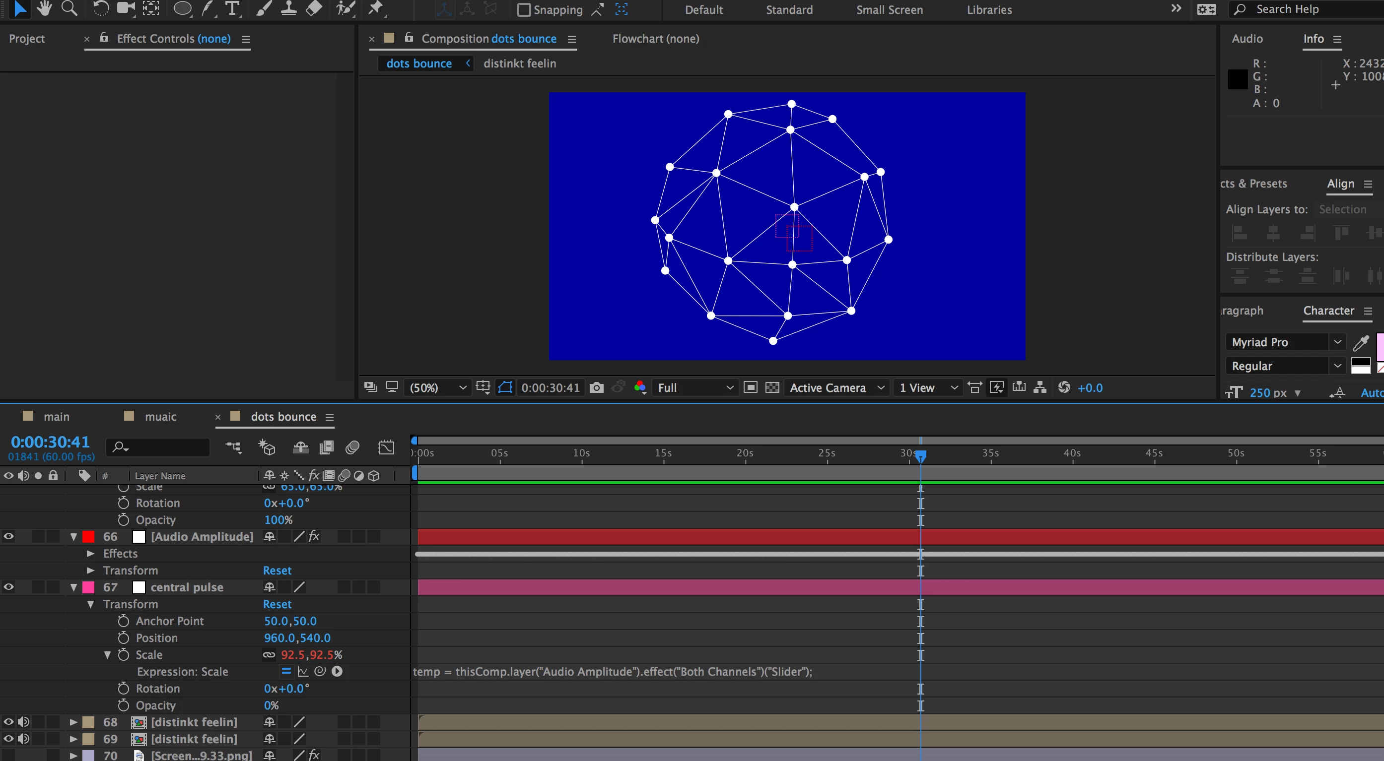 Yes you are exactly right. I want the dots to move on an axis between the centre of the comp and their original position if this is possible. As they are positioned in a ring shape I want them to wiggle outwards using an axis from the centre of the comp and their original position, and I would like them to move in relation to the audio. My apologies for being somewhat vague.
