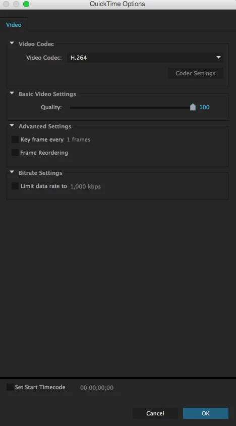 You should never use H.264 in the QuickTime container. Use the Adobe media encoder instead.