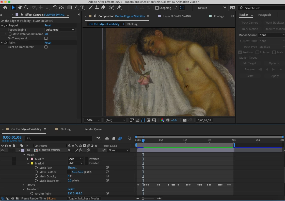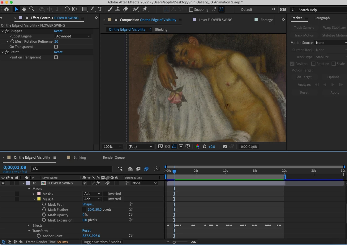 I am working on After Effects to animate a still image. I masked the particular elements that I would like to animate (the hand). However, now the remaining cutout is too sharp. Is there a way to softly erase the edges of the cutout or feather it? Using a feather on my mask did not soften the remaining cutout's edges. Am I doing something wrong?