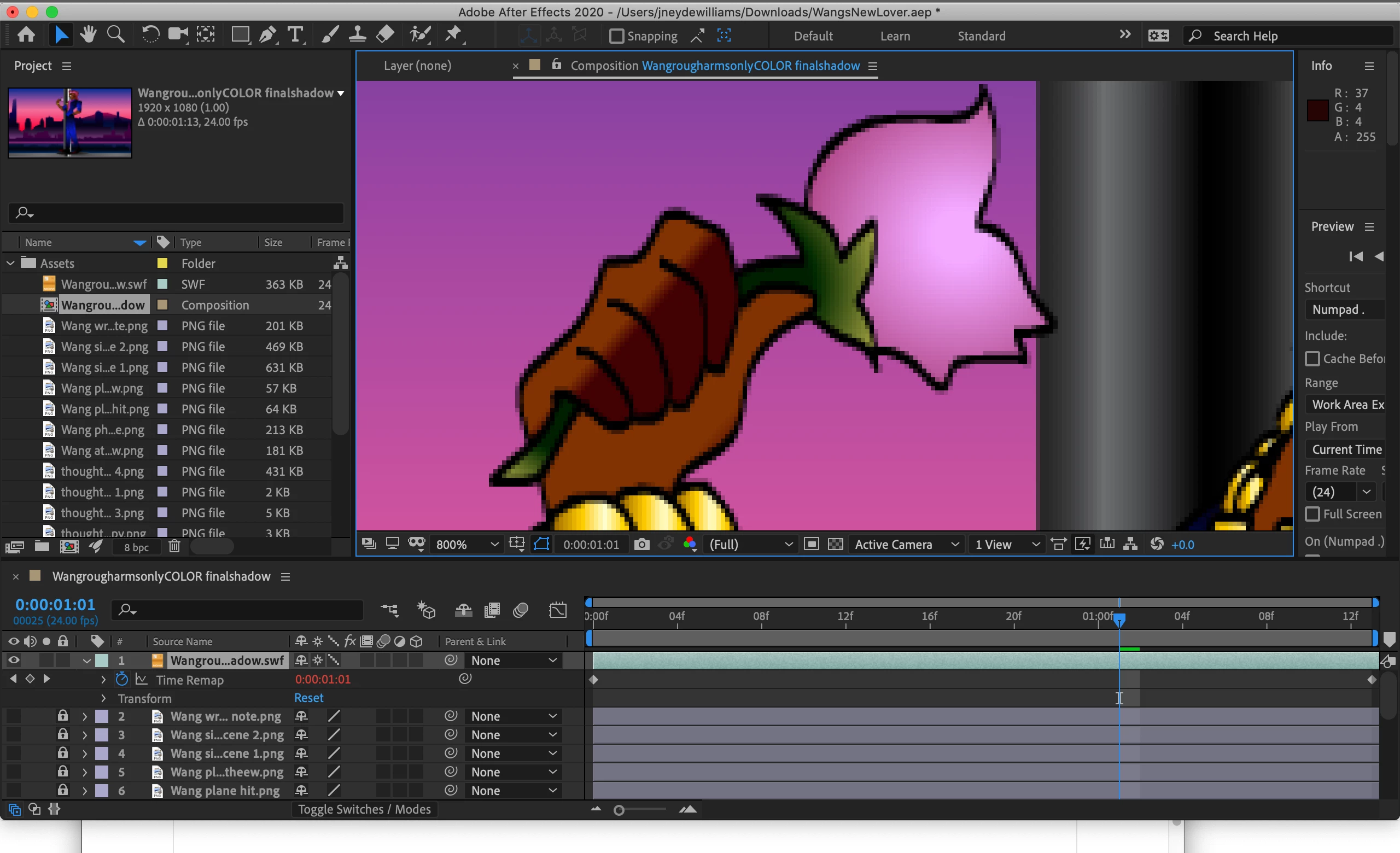 I clicked on the "continously rasterize" but still nothing. It worked before, but now no.. I restarted by placing my assets folder in again and my character is walking, so the animation is perfect. Just the pixelation when I zoom in. I also made it 3D layer for the camera to still if that would help but no.