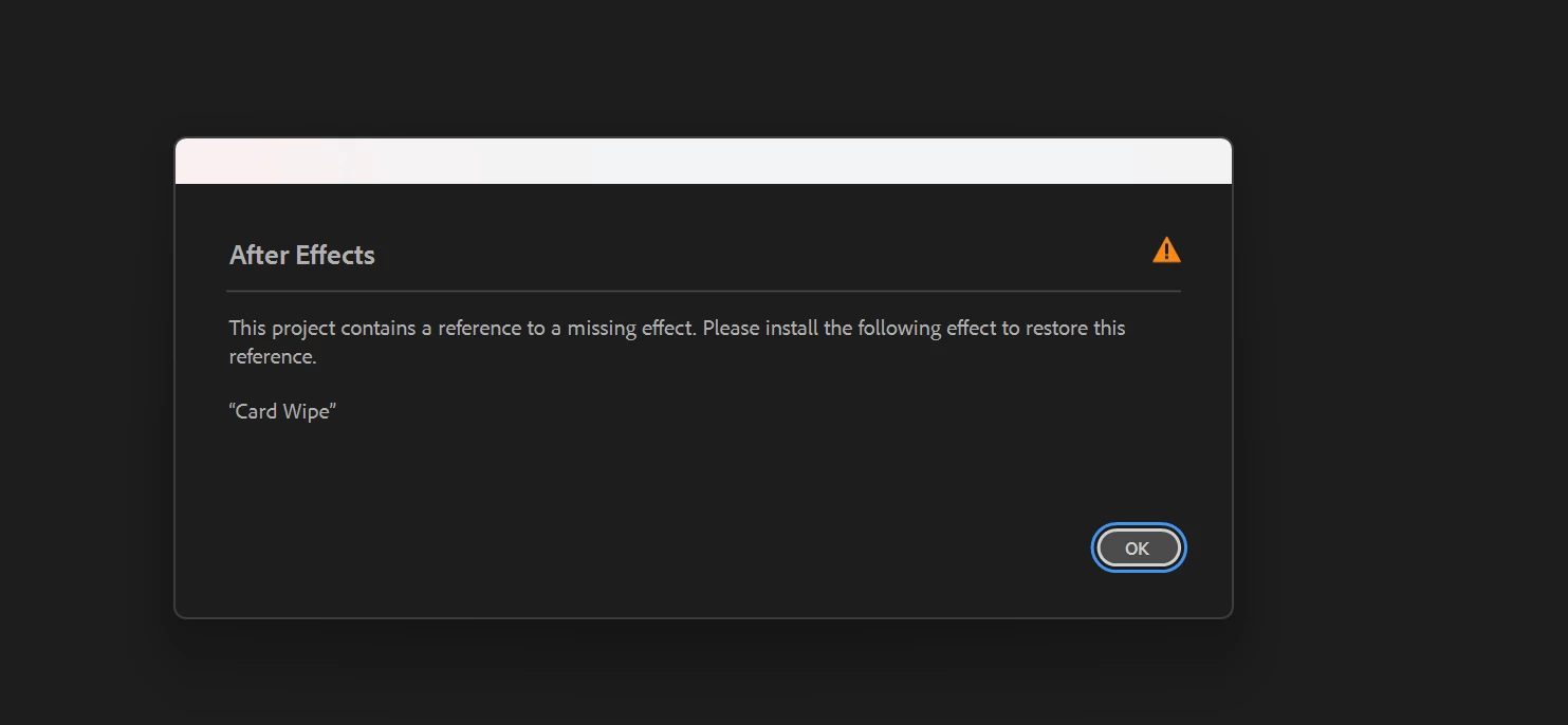 Then with no existing project open, create a solid and apply Card Wipe. If that fails, I think reinstall is the only option. If that succeeds, trying applying the effect to a old video you've never had an issue with. If that succeeds, maybe there's something wrong with the project.