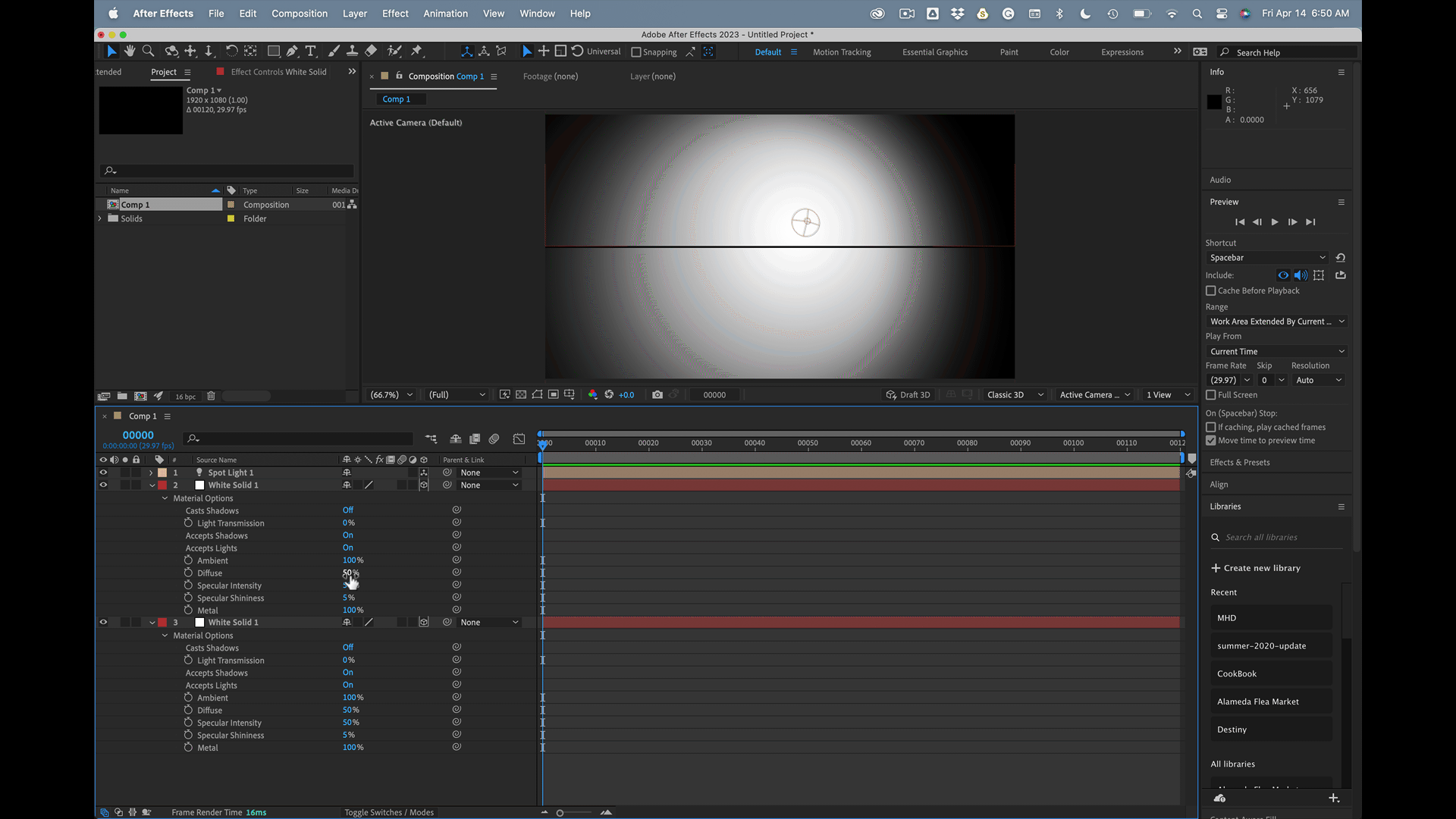The easiest way to control the way lights affect a 3D layer is to select the layer and press 'aa' to reveal material options. You can also add ambient light and adjust how ambient light affects a 3D layer.  This is a Spotlight, two identical layers, then adding ambient and making adjustments.