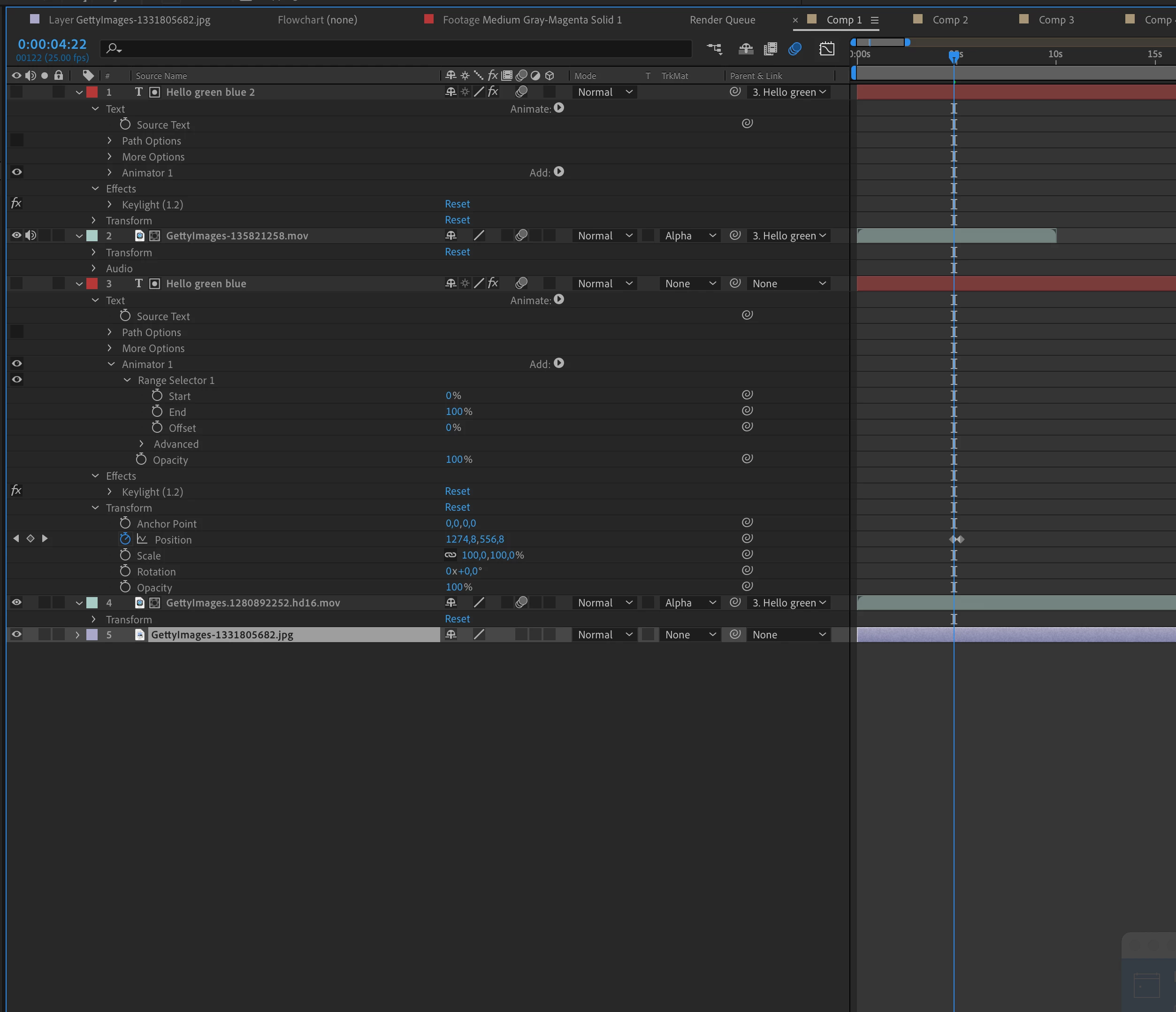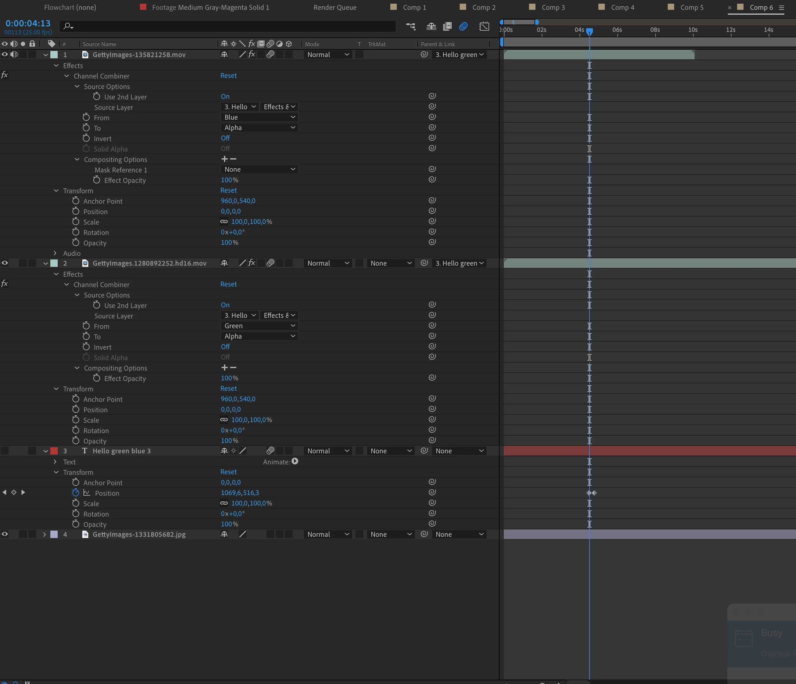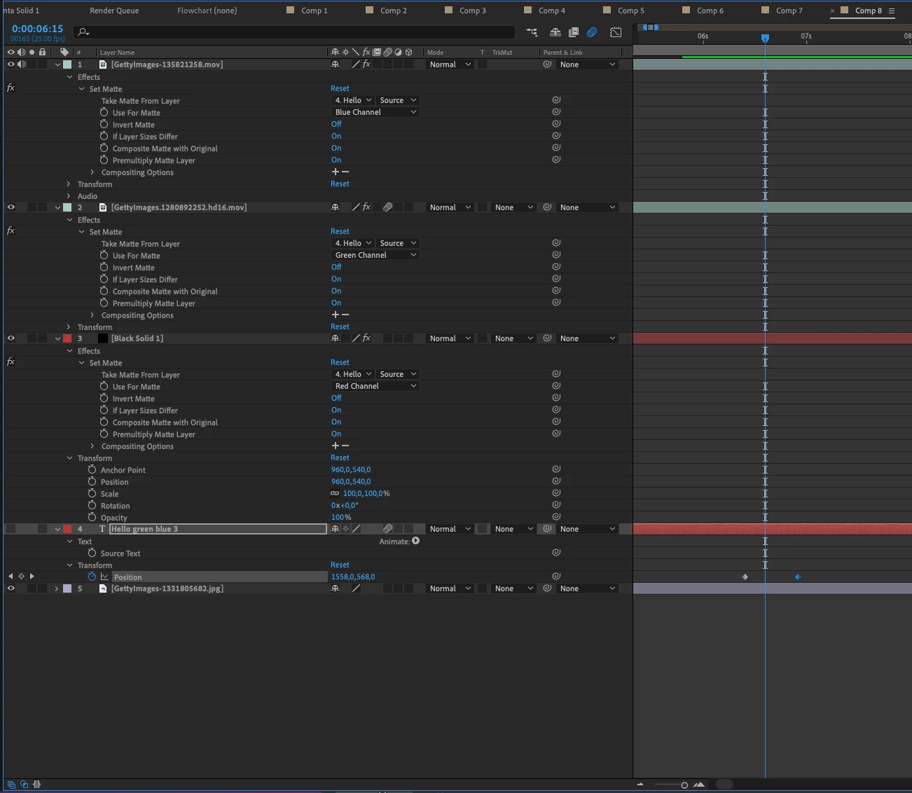 I want to make a text where some of the words are cutouts from two other layers. So some of the text is just black, one word is filled with video from layer a, another word is filled with video from layer b. The text lies on top of a backgroud image.