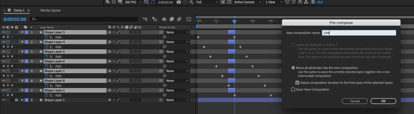 The next step was to trim the layers and create a pre-comp. I only needed to include the frames required for the line to move from the edge to the first position. Setting up the pre-comp looks like this: