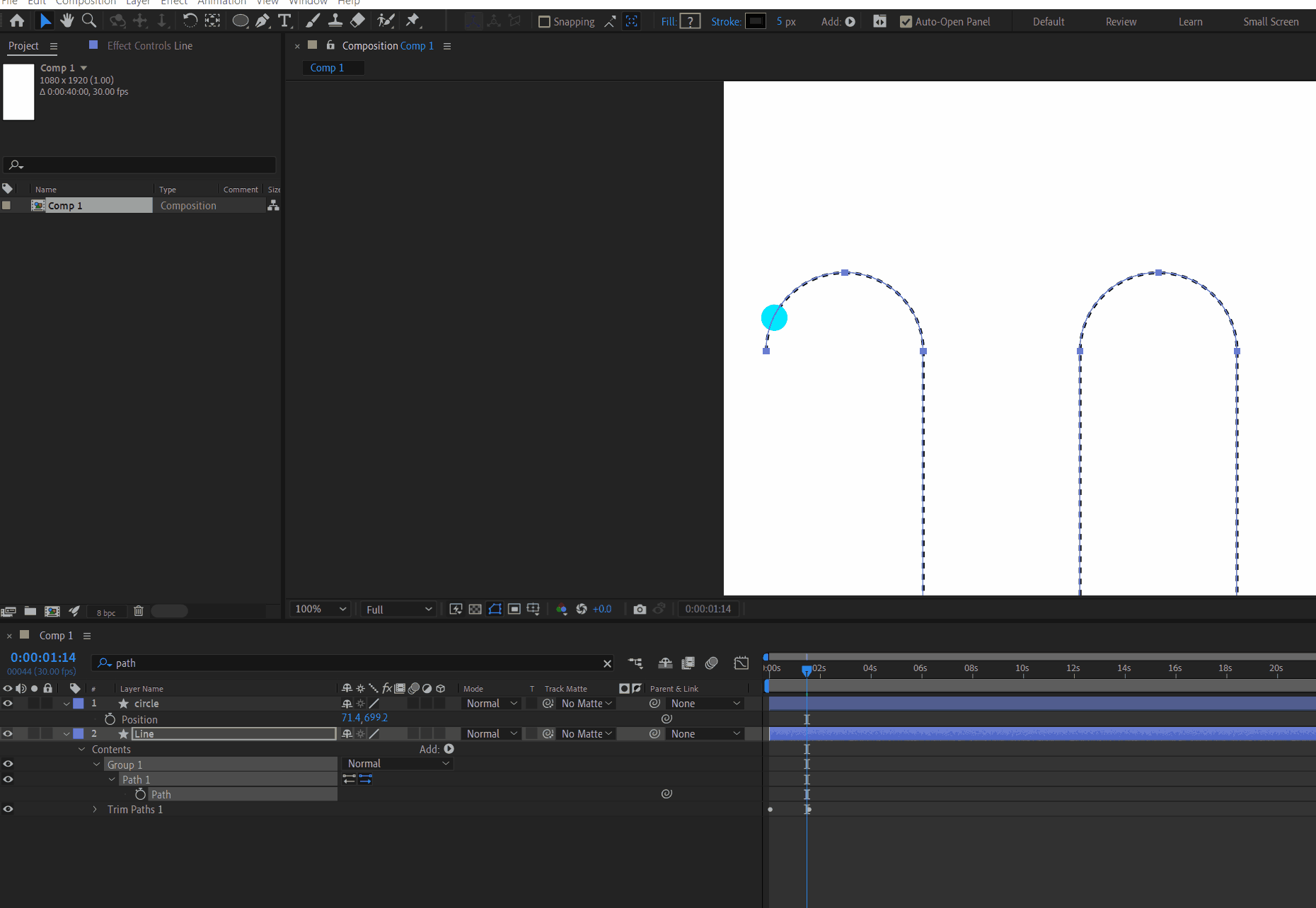 I copied pasted the 'path' of the 'Line layer' into circle's 'position; property to animate it along with the line's path. but the scale gets bigger once I paste it.. Why does this happening. I drew it in Illustrator then used overlord (App) to bring the path into AE and scaled it a bit before I animated the 'Line' layer using trim path.