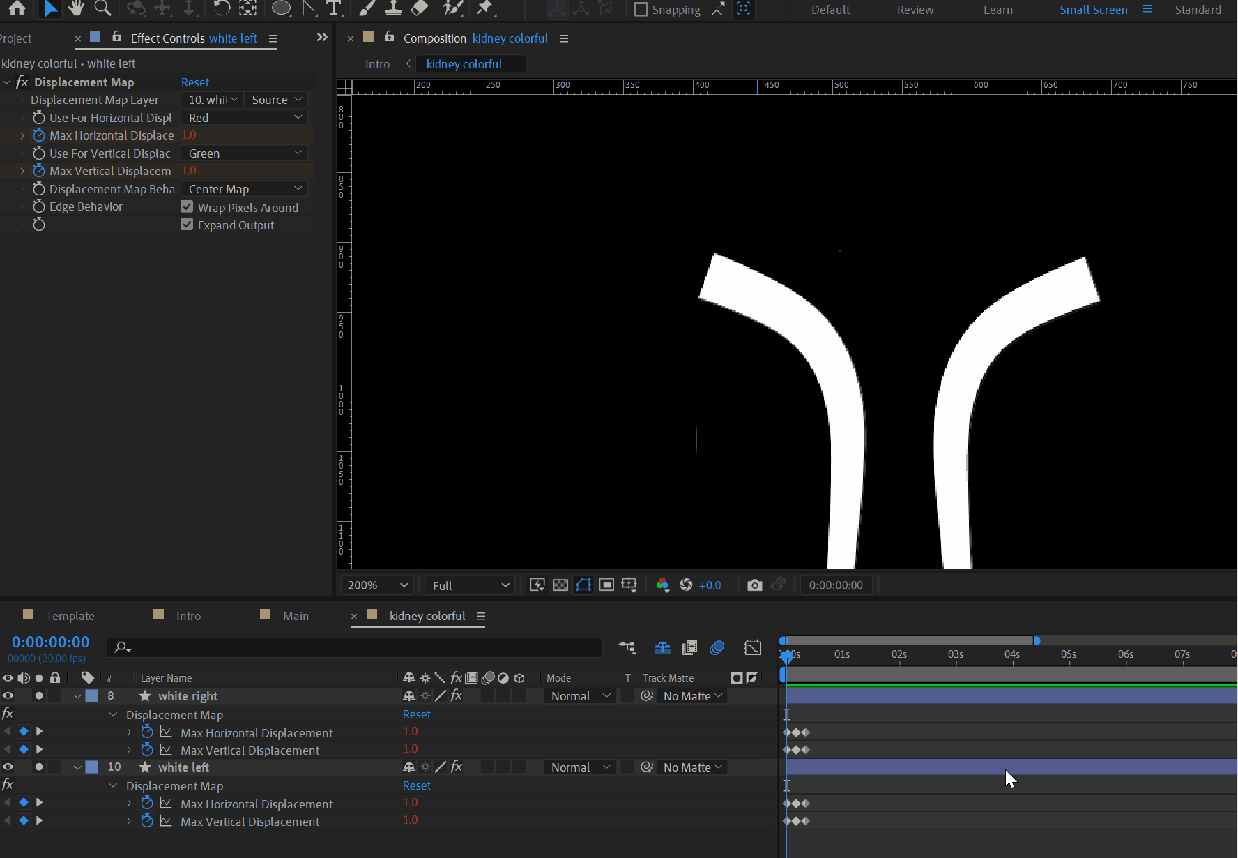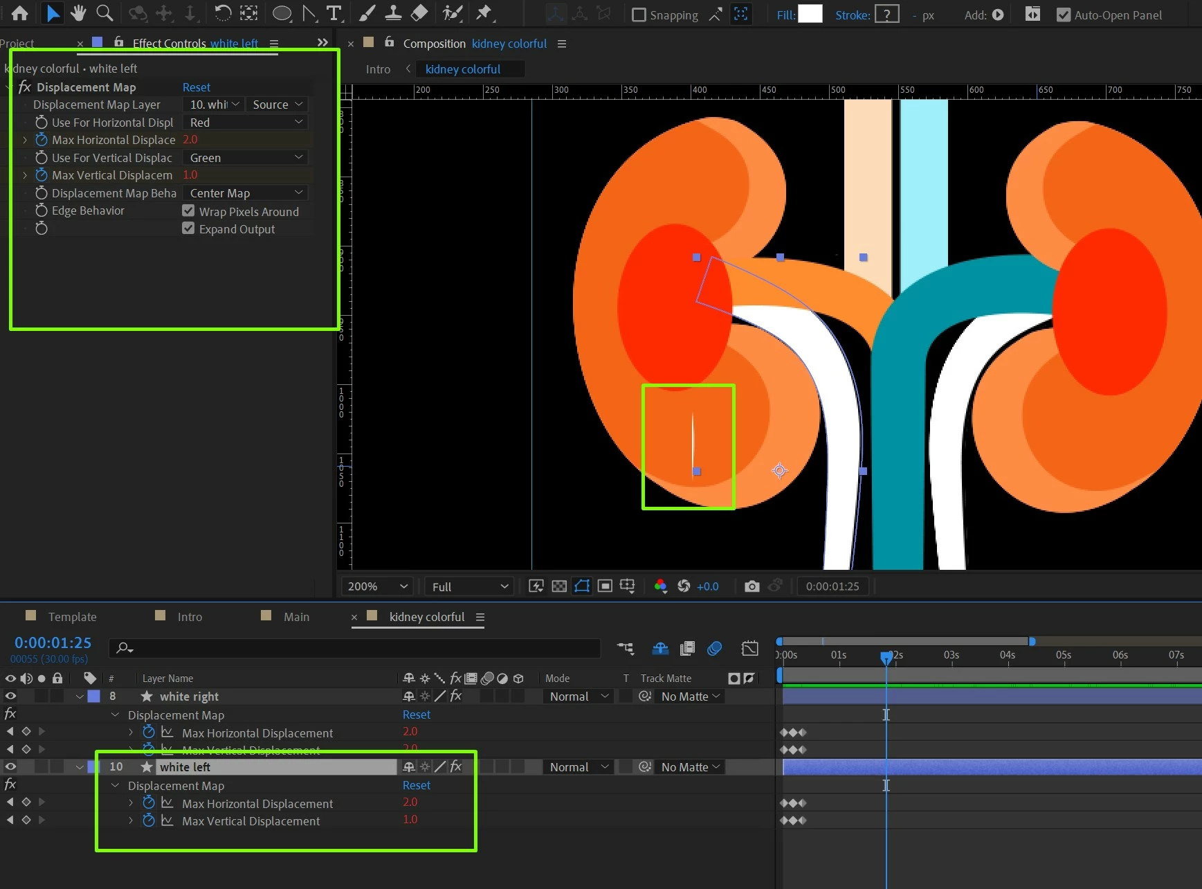 I need some guidance. I have applied displacement effect on two shape layers. one is totally okay, but another one is behaving odd. I need to solve this. Please someone help me. why am having this weird glitch thing and how can I solve it. Thank you.