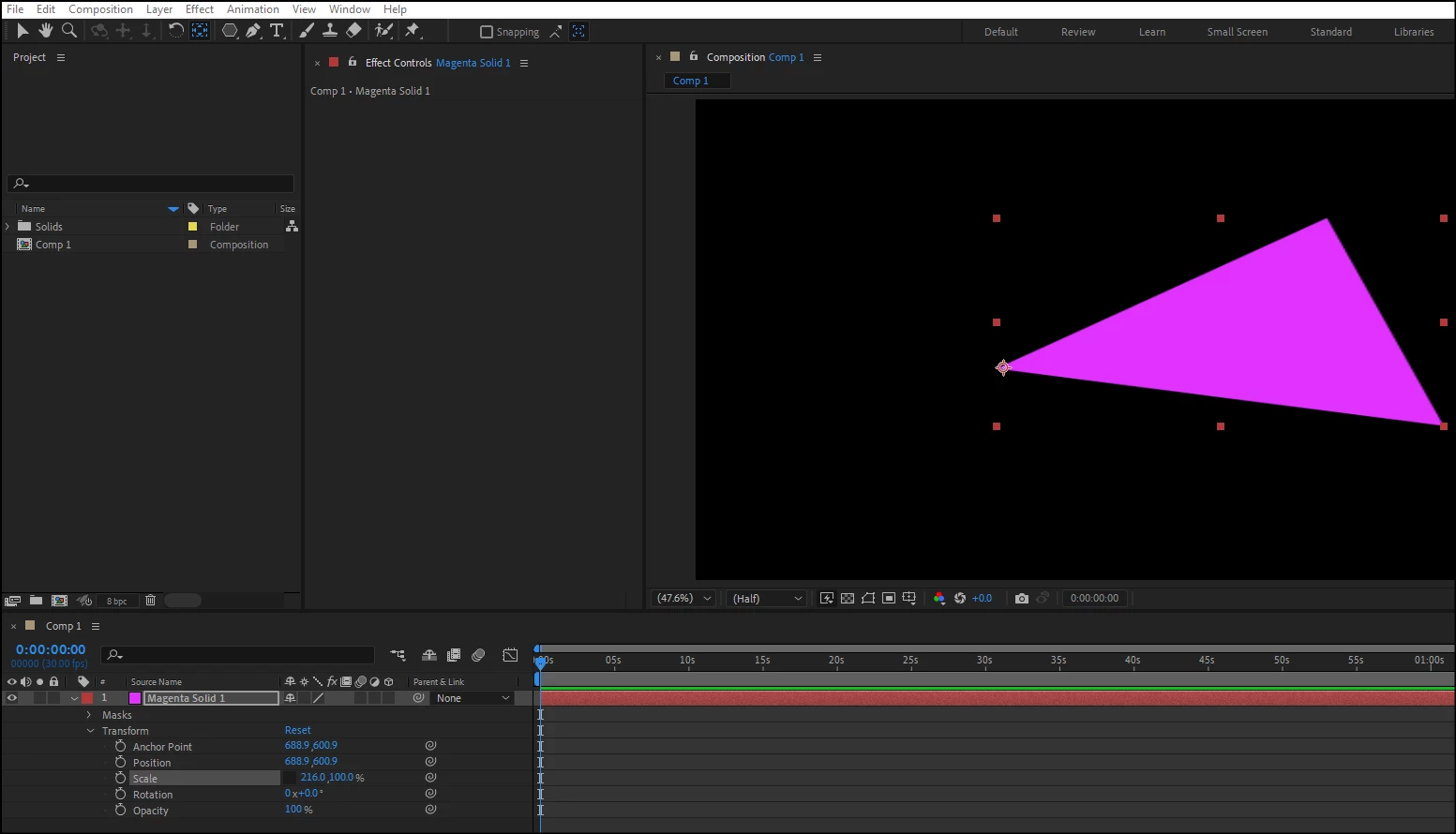 I have imported a simple 2D triangle PNG file made in paint.net. I need to stretch it but only from one of the points and only in one direction. I've looked up how-to videos on this but they all talk about shapes created within After Effects.