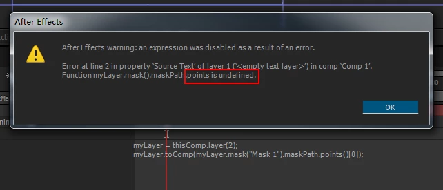 The example reads the coordinates of the first vertex of Mask 1 on Dark Gray Solid 1 and converts them to composition coordinates. Apply this to a 2D point control of an effect, such as Write-on or CC Particle Systems II, to make the effect trace or track the first point of an animated mask. Duplicate the effect and change the path points index value ([0]) to trace or track the other points of the mask.