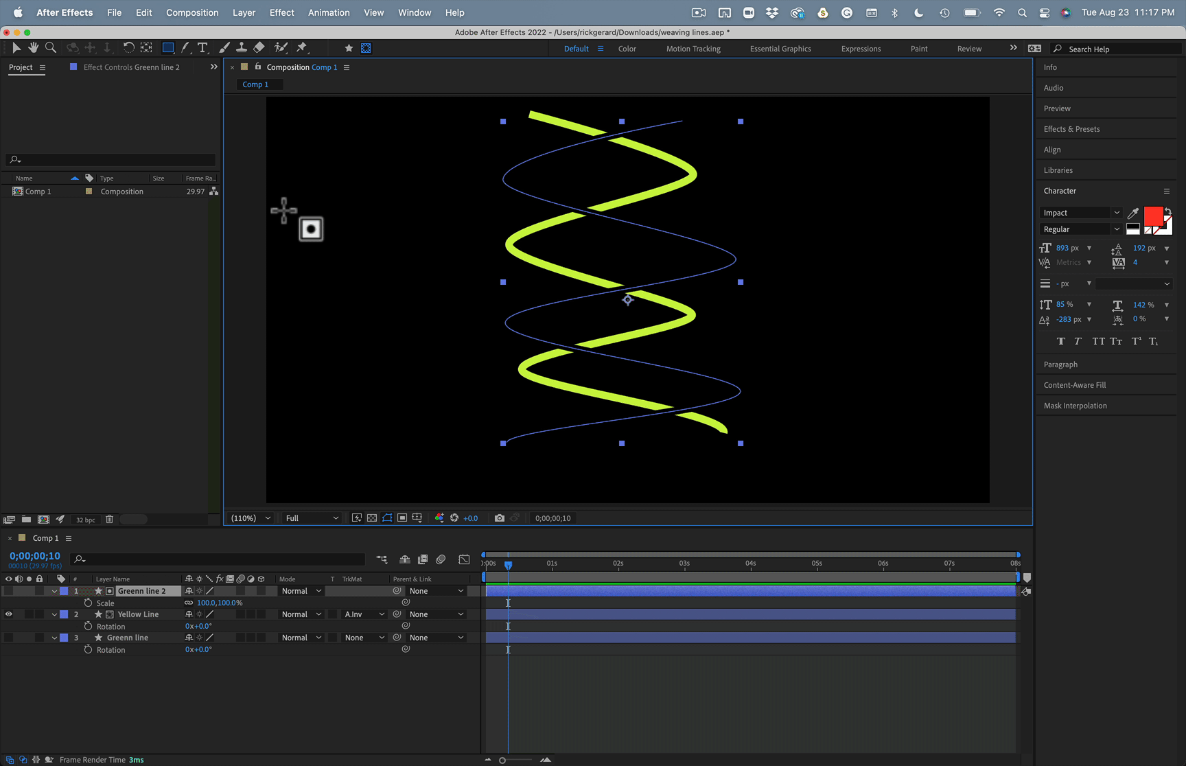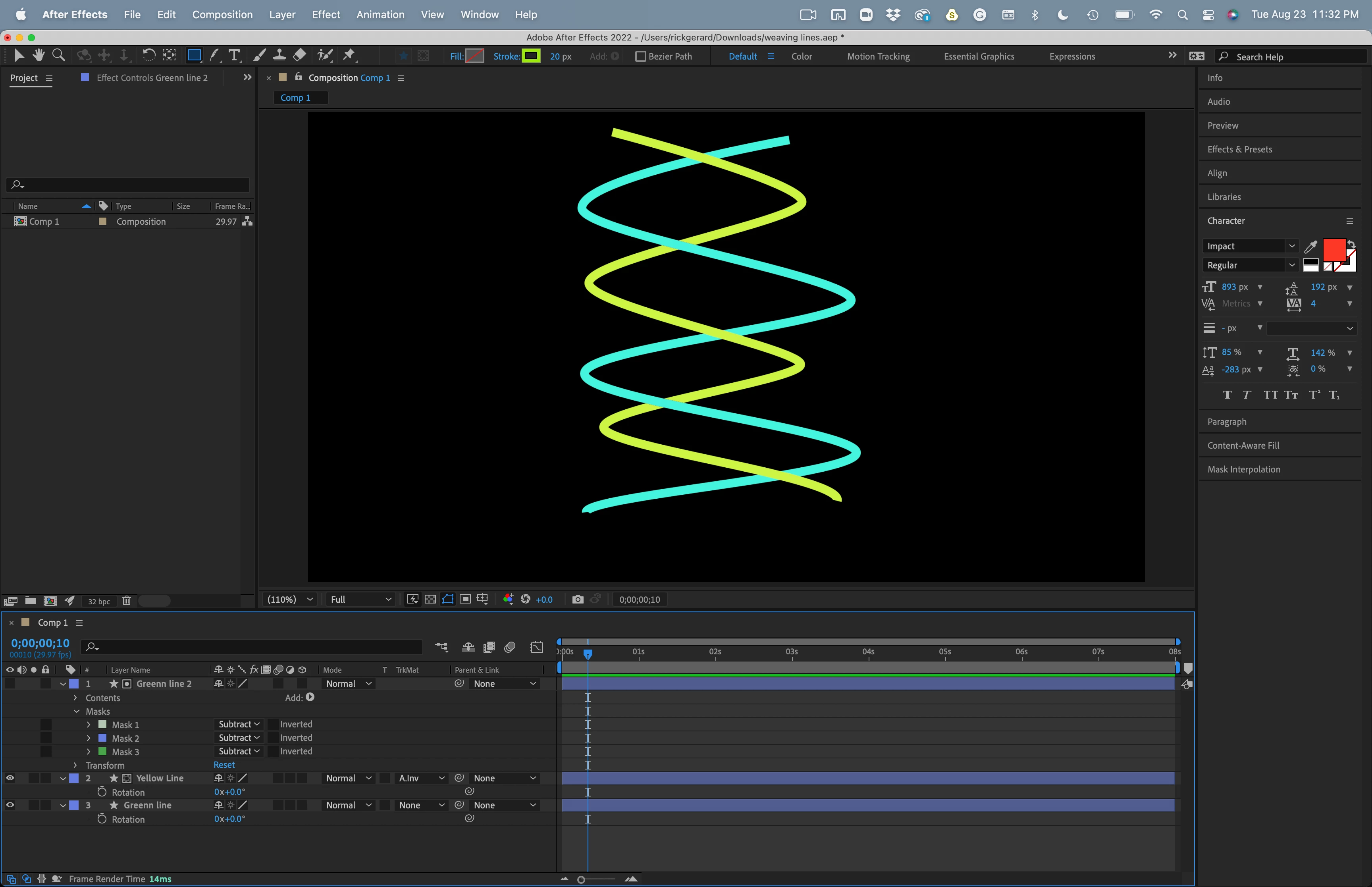 Hi there can anyone direct me to video that talks about weaving lines.  My example is not a great way to do it.  I think if the plait or weaving runs at slightly different timing you can get a pseudo effect but really weaving seems like it may be alot harder or more 3d software. My example is not the way to do it but helps show the under and over of weaving.