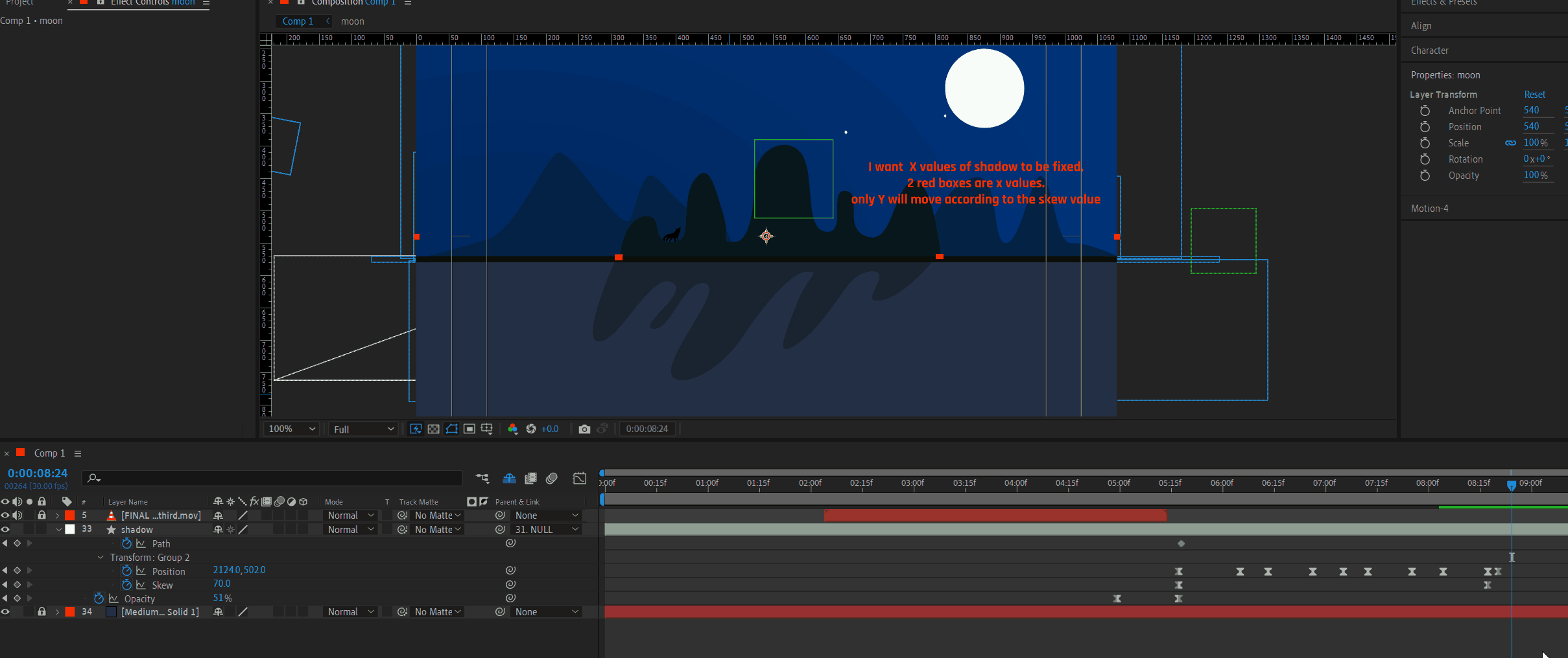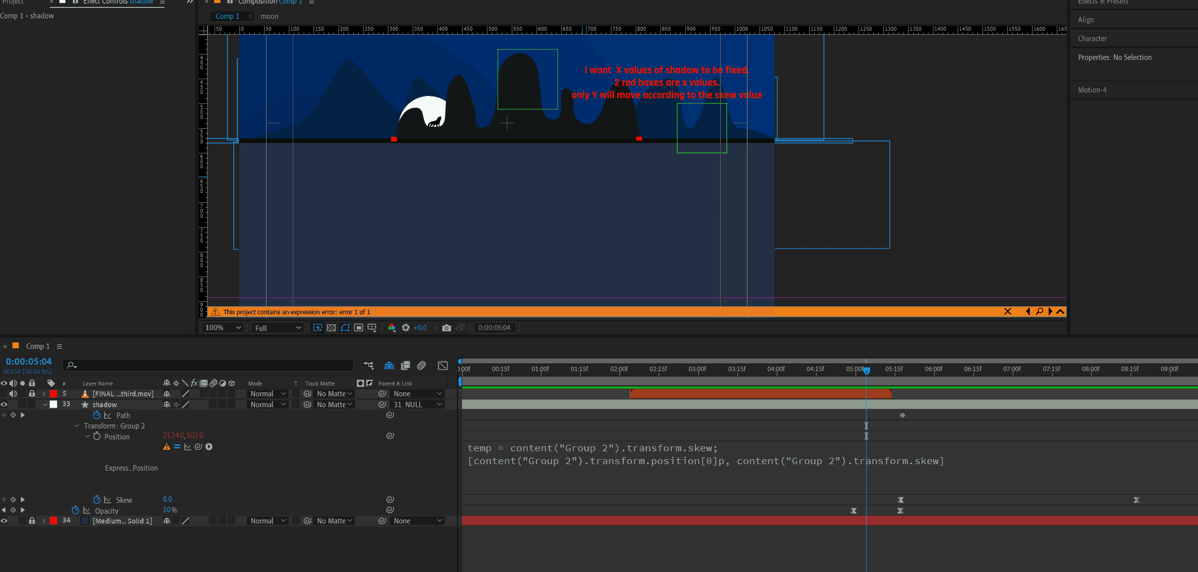 shape layer's (shadow of mountain) X value should be fixed only Y will move according to skew. But no way its working. Please guide me. I tried manullay to animate the position value. but no beauty in the movement. My eyes hurting seeing my own work 😠 please guide me. please.