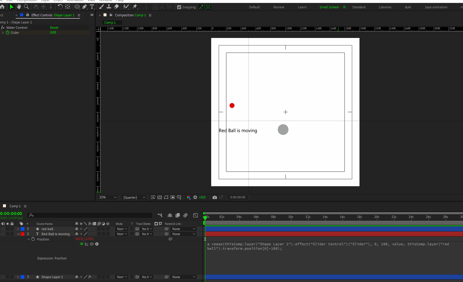 In this animation I want the text layer (‘Red ball is moving’) to follow the red ball, but the position will be slightly beneath the red ball, it will follow the whole poingpong animation but from below, not like the grey ball, which is exactly aligned with the red ball.
