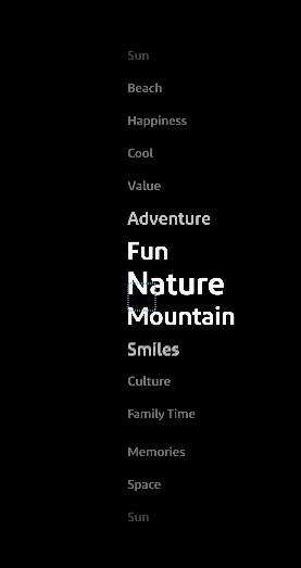 I'm looking to create a repeating list of words, that when animated go from around 40% scale at the top and bottom to 100% scale at the center, also the words should go down in opacity at the extremities.