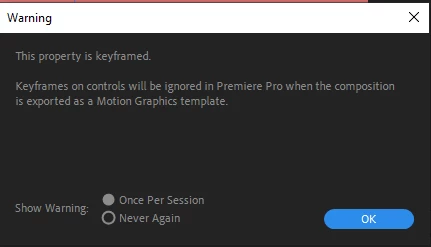 In AE, you should not place an animated property (if there is no Expression to ADJUST the animation, in PPro or AE) into the Essential Graphics Panel (EGP) if you intend to use it as a MoGRT (in Adobe PPro). When you place such a property into the EGP, you will have been prompted with the following User-error Message -