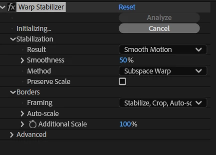 El estabilizador de deformacion sirve para video, lo que debes hacer es primero generar un video con tus fotos y luego aplicar el efecto. Quizas el video lop uedas hacer en premiere pro
