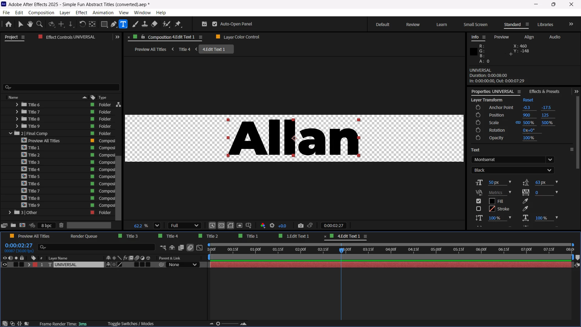 Actually, all transforms can be manipluted within the comps in the 3|Other/Elements folder. But not the within the comps in the 1|Edit/Edit Colors folder. Don't bother breaking the expression.